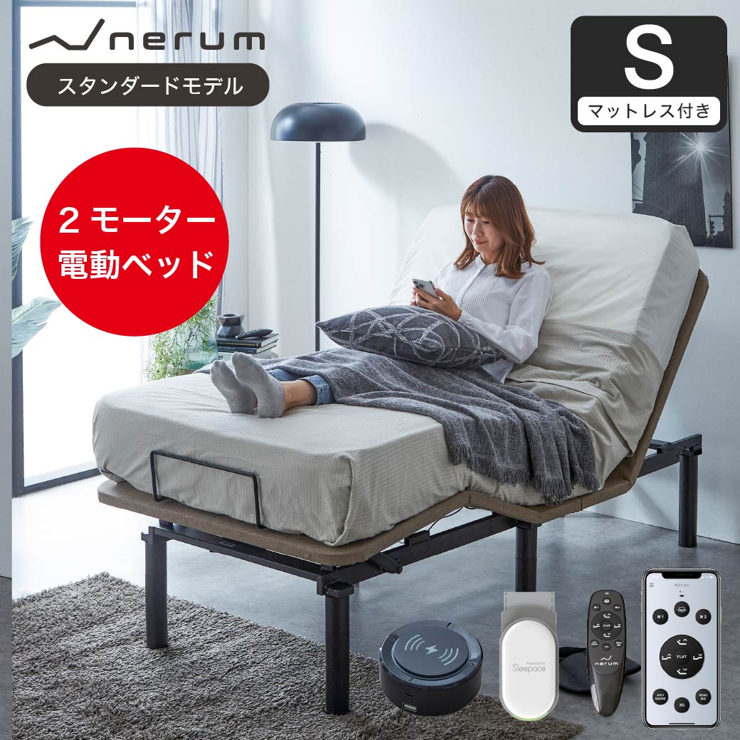 | 静音設計・2モーター内蔵!アプリ対応のアジャスタブル電動リクライニングベッドnerumapp。・専用リモコン、またはお手持ちの対応可能なOSが入ったスマホやタブレットでも頭、脚の上下リクライニング操作が可能です。・無重力ポジションやいびき防止や読書ポジションの他、自分の好きなポジションを記憶させることが可能なじぶんポジション機能があります。・脚部は2段階高さ調整ができ、安心のロースタイルからソファーのような高さまでマットレスの厚みやライフスタイルに合わせて調整可能です。・床板は通気性と耐久性に優れた、スチール・メッシュ仕様です。・リクライニング中に障害物が挟まった場合、モーターの力が加わらない、安全性の高い構造になっています。・脚を調整する事で3段階に高さ調整ができ、折り畳み収納も可能です。(バネ式ではありません)※専用リモコン用に別途単4電池が2本必要となります。電池は付属しておりませんのでご用意ください。 ■保証期間:1年 ■サイズ(約):幅97×奥行195×高さ40.7cm 【ベッド本体外寸】床面高さ20・22.7・29・31.7・40.7cm ベッド下高さ(5段階) 10・12.7・19・21.7・30.7cm 調節可能角度(約):【頭部】65°±2°【脚部】35°±2° 脚部:直径6cm 音声センサー(約):直径9×高さ4.1cmコードの長さ:2.5m 【マットレス】幅97×長さ195×高さ20cm ■材 質:【ベッド本体】 スチール(粉体塗装) 床面部:ポリエステル100% 【マットレス】 表面生地:ニット織/側面生地:3Dメッシュ (ポリエステル100%)/ 中材:ポケットコイル、ウレタン、白色ピュアフェルト※衛生・コンパクト、圧縮梱包でお届けいたします。 ■耐荷重(約):180kg ■組 立:フレーム:お客様組立(大人2名:約45分) ■生産国:中国製(商品およびモーター規格設計ドイツ)、マットレス中国 ■梱 包:計2個口:電動ベッド:102×100×13cm(43.5kg)、マットレス ■備考:コードの長さ(約):4m(電源BOX含む) 音声センサーコードの長さ(約):2.4m ※本体折り畳みについて ・他社製品のバネ式による折りたたみ式ではありません。 ・ベッドを組み立てる場合、ボルトとワッシャーの取り付けが必要です。 ・ベッドを折りたたむ場合、ボルトとワッシャーの取り外しが必要です。 ※納期表示の異なる商品を同時に購入した場合、納期の遅い商品とまとめて発送する場合がございます。予めご了承ください。 | ||||