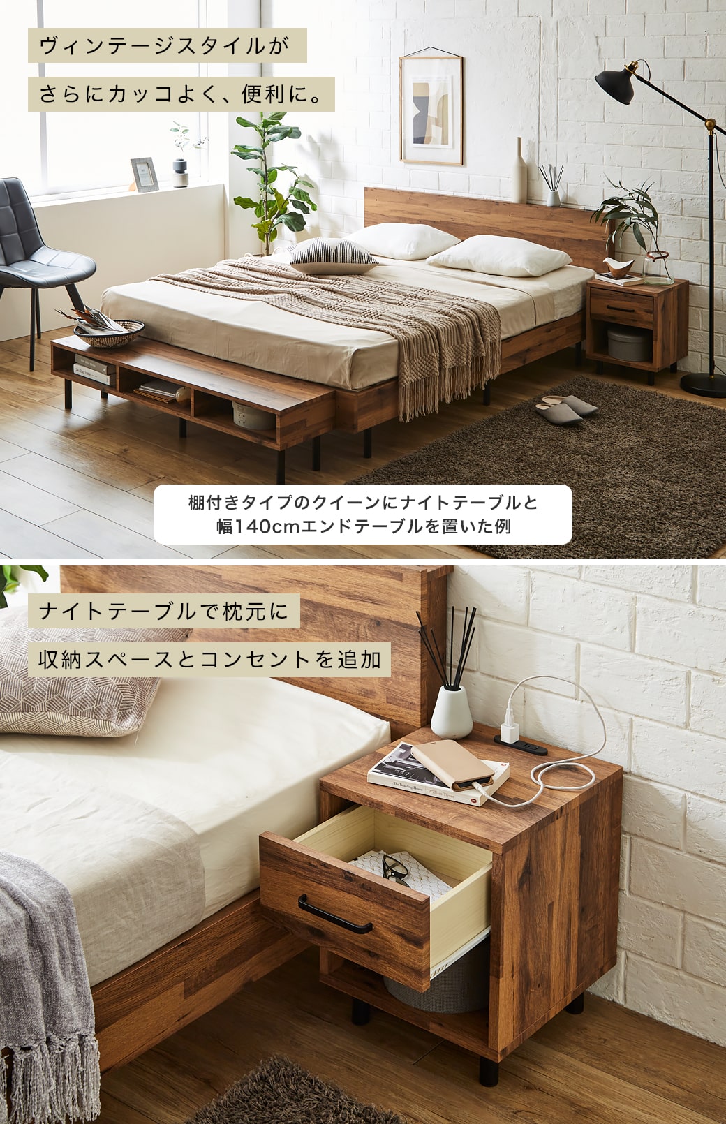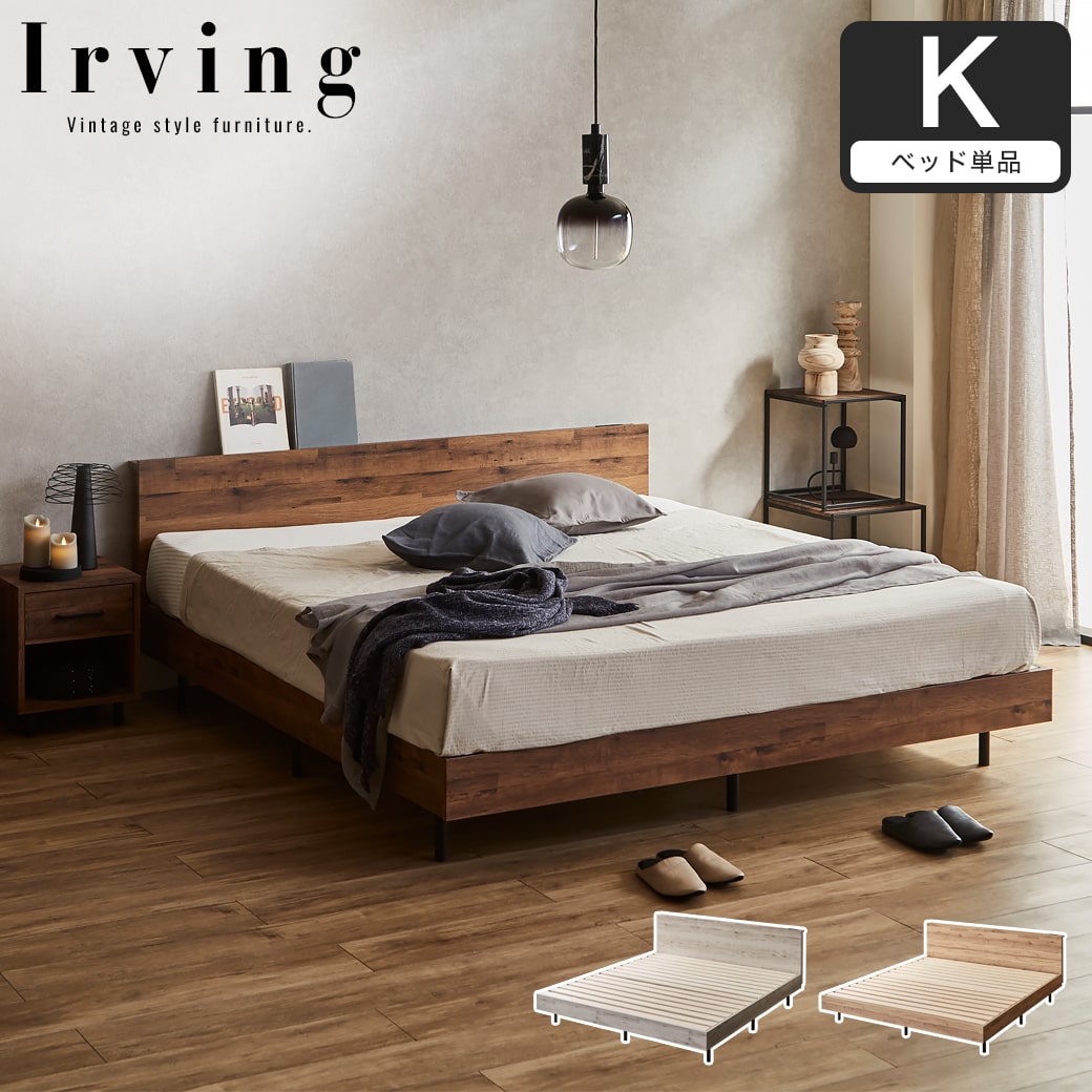 当社オリジナルの木製ベッド「アーヴィング」。味わい深い表情の木目と武骨なアイアン脚が合わさった、おしゃれなヴィンテージ調のベッドです。