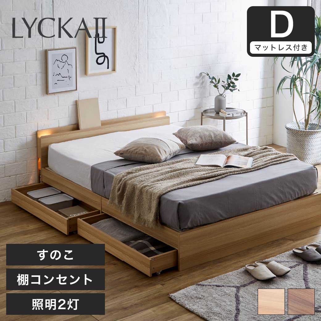 | ヘッドボードには左右それぞれ自由に点灯できる(対象:ダブル)優しい照明と、スマホやタブレットを立てかけて置いたり、小物などを置いておくことのできる便利なコンセント付きの棚。両サイドには雑誌などを収納できるオープンスペースも付いて機能性抜群。ベッド下のデッドスペースは、キャスター付きの便利な引出し収納2杯でしっかり有効活用。床板はすのこ仕様で通気性抜群、床面に溜まりがちな湿気を逃がして快適な睡眠環境に。フレームには木目調のメラミン樹脂シートを使用、汚れや粘着、傷に強く、お手入れ簡単で長く綺麗にお使い頂けます。セットのオリジナルポケットコイルマットレスは、点で支えるコイルが身体のカーブに沿って沈み込み、自然な寝姿勢をキープ。3Dメッシュの生地がマットレス内に溜まりがちな湿気を放出、清潔な睡眠環境に保ちます。 ■サイズ(約): ベッド本体: 幅140×長さ204.1(床板長さ196)×高さ58(床面高26.3)cm 引出し外寸/内寸: 幅95.4(88)×長さ41.6(38.4)×高さ11.8(9.4)cm 棚部寸法: 有効幅136.2×奥行8.1(有効奥行4.5)cm マットレス外寸: 幅140×長さ195×厚さ20cm ■材質: ベッド本体 メラミン樹脂シート張り化粧板、合板 ※第三者機関による3000N(300kgf)の荷重試験に合格。 耐荷重はおよそ150kgを目安にお使いいただけます。 マットレス 表面生地:ポリエステル100%ニット織 側面生地:3Dメッシュ 中材:ポケットコイル、ウレタン、白色ピュアフェルト コイル数:682個、コイル線径:2.0mm、コイル巻き数:5.5巻き、コイル鋼線種:SWRH72B ※衛生・コンパクト、圧縮梱包でお届けいたします。 ※第三者機関による、8万回の耐久テストクリア ■耐荷重(約):約150kg ■組立:お客様組立品(2名約60分) ■使用工具:プラスドライバーをご用意ください。 ■生産国:中国製 ■梱包:・梱包サイズ: 1:幅143×奥行64×高さ13cm 2:幅100.5×奥行42×高さ17cm 3:幅137.9×奥行49×高さ7.5cm 4:幅137.9×奥行49×高さ7.5cm 6:マットレス ■備考: |