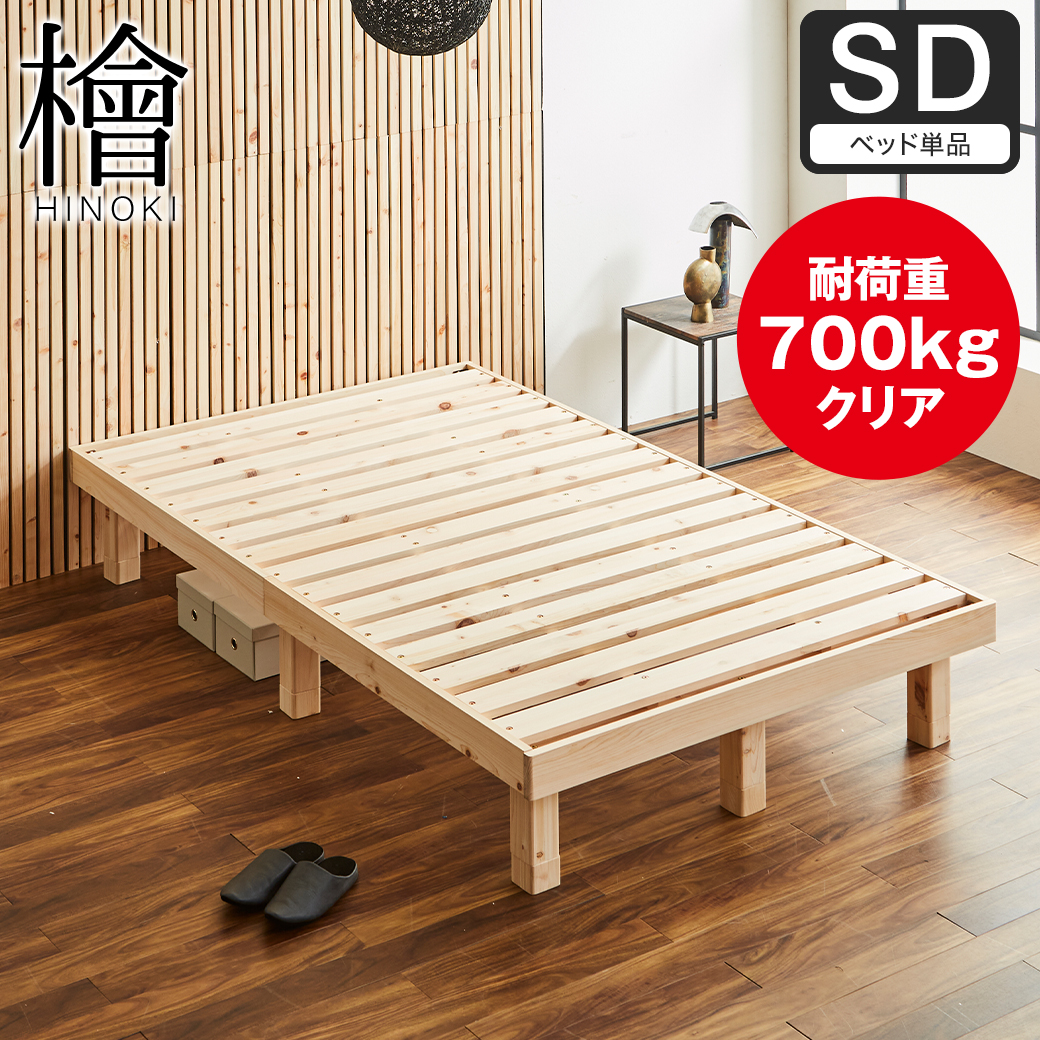 フレーム・すのこも檜材を使用 檜すのこベッド セミダブル 木製ベッド ヘッドレスベッド フレームのみ 総檜ベッド 国産檜を贅沢に使用した 天然木 檜ベッド 総檜 床面高さ4段階調節 湿気を上手に逃がす[すのこ床板]スノコベッド セミダブルベッド マットレスでも布団でも使いやすい 丈夫なベッド 檜特有の芳香が楽しめるひのきベッドです。 ■サイズ(約): (約)幅120.2×奥行197.6×高32cm 床面有効サイズ:(約)幅120×奥行196cm 床面高4段階(約):32、26.3、13.2、8.6cm ■材質: 天然木ひのき材(無塗装) ■組立:お客様組立品(大人2人40分) ■生産国:企画:日本 生産国:ベトナム ■床面静止耐荷重:(約)350kg ■梱包サイズ:(個口数1)124.5×38×23.5cm(27kg) ■備考: ・床キズ防止フェルト付き ※天然木を使用している為、節がございます。ひのき天然木の素材の良さ、味わいとしてご理解下さい。 ※商品説明写真に使われている 、小物類等は、商品に含まれておりません。