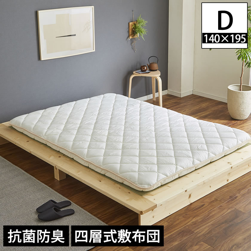 | 四層敷き布団 抗菌防臭 12cm厚 ダブル 長さ(約)195cmのベッドで使える敷き布団。ベッドには長すぎたり短すぎたりすることが多い「敷き布団」をベッドに使いやすい長さにつくりました。 側生地 綿100% 固綿2枚重ね ボリューム感と床付き感の軽減、カラダの沈み込み過ぎを抑え 快適快眠サポート 巻綿には清潔に安心してお使い頂けるように、抗菌防臭加工 SEKマーク(青)取得した シキボウ「ノンスタック加工」中わたを使用しています。固綿をふんわりやわらかい中綿でくるみ、ボリュームのあるお布団に仕上げました。国内の工場で生産された日本製 敷き布団 4層式敷ふとん ベッドはもちろん、フローリングや畳に敷いてお使いいただけます。 ■サイズ(約): 幅140×長さ195×厚12cm ■材質: 側生地:綿100%(205本ブロード40番手 縦133本横72本 高密度で織り上げた生地です。) 巻綿:ポリエステル100% (シキボウ 抗菌防臭防ダニ加工ノンスタック使用)(重量:約2.6kg) 固綿(中芯):ポリエステル100%(ポリエステル圧縮固綿(約4cm厚)×2枚)(重量:約4.0kg) ■組立:完成品 ■生産国:日本製 ■梱包:1個口:75×45×50cm ■備考: 【BE】 ※商品画像は色合いや素材感が実際の商品と異なる場合がございます。 モニター・ディスプレイによっても写り方が変ります。予めご了承ください。 |