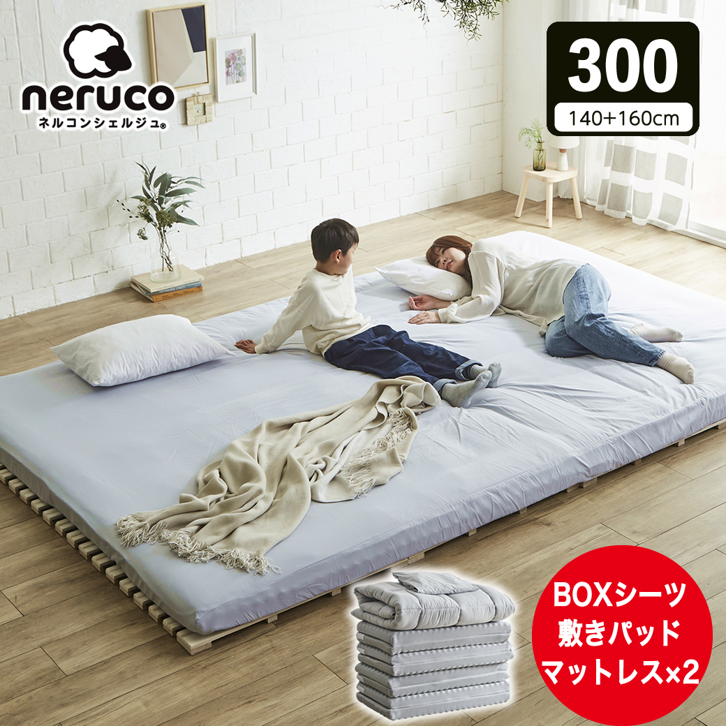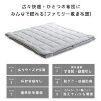 | つなげて広がる!家族一緒のおやすみを叶えるファミリーサイズの敷き布団 敷き布団+敷きパッド+大きな敷き布団にピッタリサイズの大きな専用ボックスシーツBOXシーツがセットになったオールインワンタイプ。簡単連結・面ファスナーでマットレスをくっつけるだけ!みんなで寝てもズレにくい、見た目もフラットできれいです。敷き布団は軽量・4つ折りタイプ。床付き感のない厚みたっぷり7cm厚 凸凹型高反発プロファイルウレタンを採用。好通気、点で身体を支える体圧分散性も特長です。カバー(側地)は全面通気性のよいメッシュ生地。湿気はため込みません。敷きパッドは大きな1枚タイプ。つなぎ目がなく寝心地も快適。中わたをたっぷり詰め込んだフカフカボリュームタイプ。中わたは防ダニ・抗菌防臭加工でダニを寄せ付けにくく 嫌なニオイも防ぎます。簡単に付け外し可能な4隅ゴムバンドで寝返りをうってもズレにくい。家族みんなで眠れる大きなサイズのファミリーサイズ敷き布団にピッタリ設計。専用サイズのBOXシーツは寝る面に継ぎ目のない大きな生地を使用したシームレスタイプ。洗濯もできるのでいつも清潔にお使いいただけます。 ■サイズ(約):幅300(140+160)×長さ195×厚12(敷きパッド5cm+ウレタンマットレス:7cm)cm ■材質:【敷き布団】 ・側生地:ポリエステル100%、ハニカムメッシュ生地 ・詰め物:高反発プロファイルウレタン(密度:34D、復元率:97.8%、硬さ:230N) 厚み:7cm 【敷パッド】 ・側生地:ポリエステル100% ・中わた:ポリエステル100%(防ダニ抗菌防臭わた) 【BOXシーツ】 ・ポリエステル100% ■組立:完成品 ■生産国:中国 ■梱包:2個口:(2-1)46×46×55cm(7.5kg)(2-2)72×41×55cm(11.6kg) ※商品は「圧縮梱包」でのお届けです。 ■備考: ・敷きパッド四隅ゴム仕様 ・洗濯機をご使用の場合は、お使いの洗濯機の容量・取扱説明書にしたがって洗ってください。 ・洗濯お手入れの際は、必ず洗濯表示をお確かめの上お洗濯をお願いいたします。 ・敷き布団のメッシュカバーは洗濯が可能です。(中材のウレタンは洗濯不可) 【GY】 |