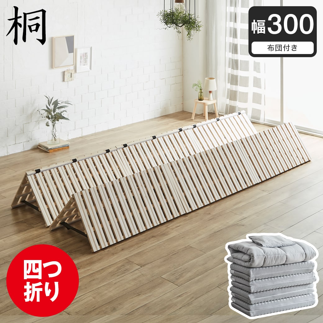 | 当社オリジナルの四つ折り式木製すのこマット。 家族みんなでゆったり寝れる幅広いファミリーサイズが登場です。 桐材を使用したシンプルなすのこながらも、使い勝手のいい工夫が詰まった快眠アイテムです。 お部屋の床に布団やマットレスを直置きするのではなく、桐すのこマットを1枚挟むだけで、寝具の通気性が改善し、不快なカビやダニ、また冬の結露の発生を抑制します。 ■保証期間:1年 ■サイズ(約):・ベッド外寸:幅300(100×3枚)×長さ197×高さ3.4cm(※バンドで連結してあるため縮めると長さはマイナス12cmとなります。) ・敷布団外寸:幅300(140+160)×長195×厚さ12cm(ボックスシーツのマチ14cm、敷きパッドの厚さ5cm、ウレタンマットレスの厚さ7cm) ■材 質:【ベッド】 天然木桐材(無塗装) 【ボックスシーツ】 ・ポリエステル100% 【敷パッド】 ・側生地:ポリエステル100% ・中わた:ポリエステル100%(防ダニ抗菌防臭わた) 【敷き布団】 ・側生地:ポリエステル100%、ハニカムメッシュ生地 ・詰め物:高反発プロファイルウレタン(密度:34D、復元率:97.8%、硬さ:230N) 厚み:7cm ■耐荷重(約):100kg ■組 立:完成品 ■生産国:中国 ■梱 包:・ベッド:1個口:(1-1)48×44×103cm(24kg) ・布団:1個口 ■備考:※納期表示の異なる商品を同時に購入した場合、納期の遅い商品とまとめて発送する場合がございます。予めご了承ください。 |
