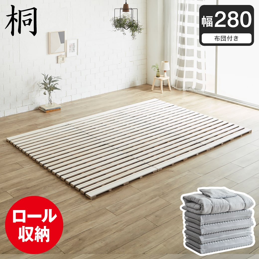 | 当社オリジナルのロール式木製すのこマット。 家族みんなでゆったり寝れる幅広いファミリーサイズが登場です。 桐材を使用したシンプルなすのこながらも、使い勝手のいい工夫が詰まった快眠アイテムです。 お部屋の床に布団やマットレスを直置きするのではなく、桐すのこマットを1枚挟むだけで、寝具の通気性が改善し、不快なカビやダニ、また冬の結露の発生を抑制します。 ■保証期間:1年 ■サイズ(約):・ベッド外寸:幅280(93.3×3枚)×長さ197×高さ3.4cm(※バンドで連結してあるため縮めると長さはマイナス57cmとなります。) ・敷布団外寸:幅280(140+140)×長195×厚さ12cm(ボックスシーツのマチ14cm、敷きパッドの厚さ5cm、ウレタンマットレスの厚さ7cm) ■材 質:【ベッド】 天然木桐材(無塗装) 【ボックスシーツ】 ・ポリエステル100% 【敷パッド】 ・側生地:ポリエステル100% ・中わた:ポリエステル100%(防ダニ抗菌防臭わた) 【敷き布団】 ・側生地:ポリエステル100%、ハニカムメッシュ生地 ・詰め物:高反発プロファイルウレタン(密度:34D、復元率:97.8%、硬さ:230N) 厚み:7cm ■耐荷重(約):100kg ■組 立:完成品 ■生産国:中国 ■梱 包:・ベッド:1個口:(1-1)39×42×96cm(20kg) ・布団:1個口 ■備考:※納期表示の異なる商品を同時に購入した場合、納期の遅い商品とまとめて発送する場合がございます。予めご了承ください。 |