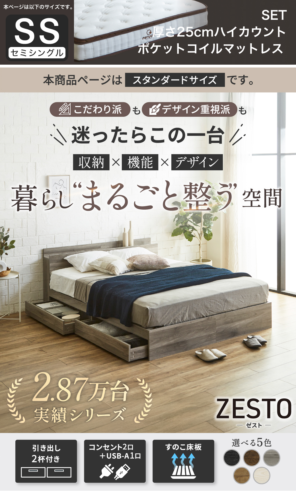 | 「機能性とデザイン性を兼ね備えた大容量収納付きベッド」 おしゃれで実用的な収納付きベッドが登場。セミシングル・シングル・セミダブルの豊富なサイズ展開。 ヘッドボードにはUSBポート1口、コンセント2口の計3口を搭載し、スマートフォンの充電も可能です。 耐水性・耐熱性・耐摩耗性に優れた「メラミン化粧板」を採用し、美しさと耐久性を両立。さらに、キャスター付きの2杯引き出し収納を備え、衣類や小物をすっきり整理でき、ベッド下を有効活用できます。 シンプルで北欧風のデザイン、充実した収納力、便利な機能が詰まったベッドです。 ■保証期間:ベッドフレーム:1年、ハイカウントマットレス:5年 ■サイズ(約):幅80.2×奥行213.4×高さ71.8cm マットレス:幅80×奥行195×高さ25cm、ベッドフレーム床面有効長さ:197.6cm、床面高26.5cm、引き出し内寸:幅91.9×奥行39.4×高さ7.7cm ■材 質:フレーム:メラミン樹脂シート張り化粧板、LVLすのこ床板 マットレス:表面生地・テンセル:37%。ポリエステル:63%、側面生地・テンセル:37%。ポリエステル:63%、3Dメッシュ、 中綿:ポリエステル100%(テイジン マイティトップ2抗菌防臭防ダニわた入り)中材:ポケットコイル、ウレタンフォーム、フェルト、コイル線径:1.3mm、1.4mm ■耐荷重(約):ベッドフレーム:150kg ■組 立:フレーム:組立品(大人2人約120分) 使用工具:プラスドライバーをご用意ください。 マットレス:圧縮梱包を開封・復元する作業があります。 ■生産国:中国 ■梱 包:フレーム1)幅104×長さ34.5×高さ20cm 梱包重量:23kg、2)幅87.5×長さ37.5×高さ19cm 梱包重量22kg、※他マットレス ■備考: ![]() ゼスト専用開梱組立設置サービス ※納期表示の異なる商品を同時に購入した場合、納期の遅い商品とまとめて発送する場合がございます。予めご了承ください。 |