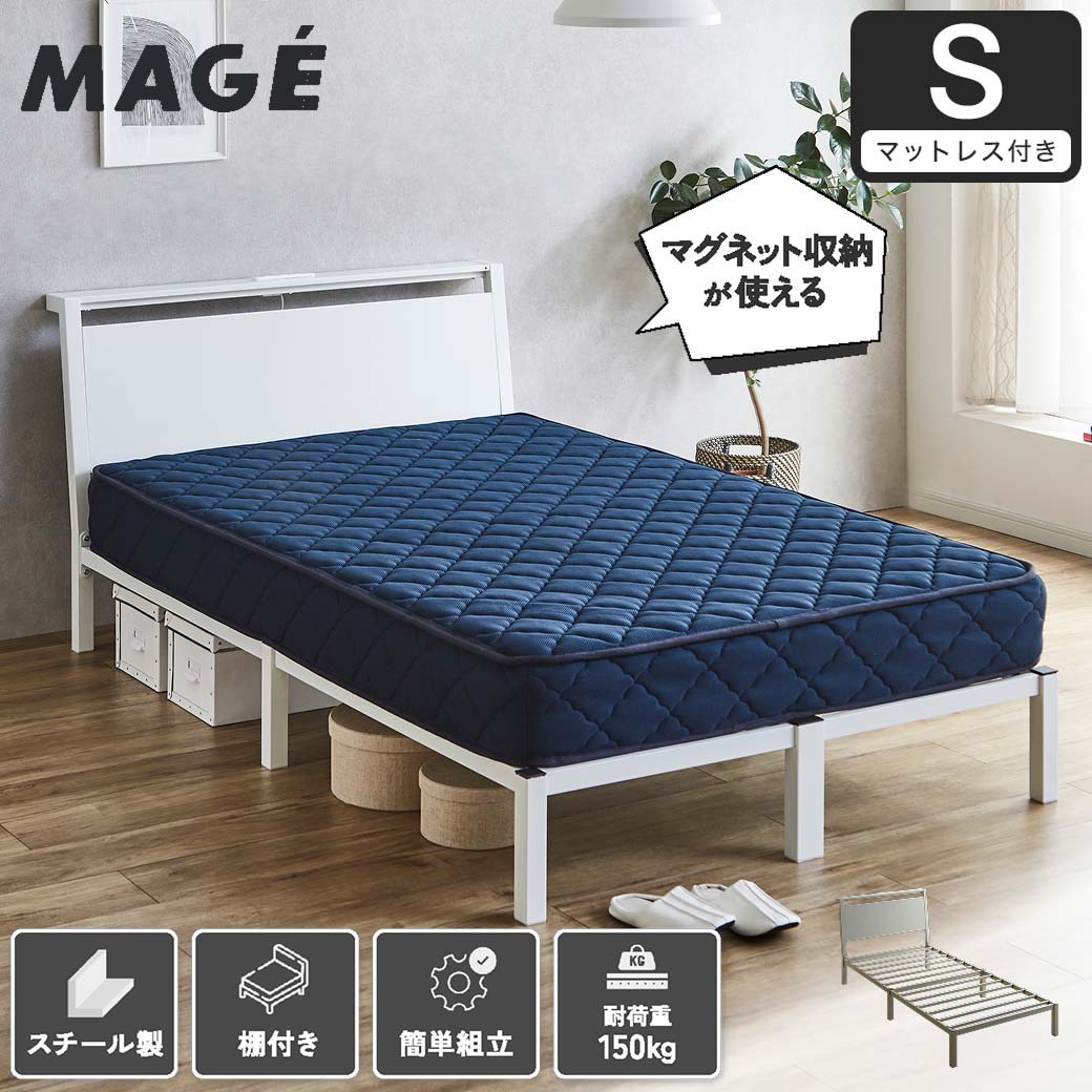 | 自由にアレンジできるスチール製ヘッドボードが魅力の「マグネット対応ベッド」。お気に入りのグッズや小物をマグネットで飾れる“見せる収納”で、自分だけの特別な空間を演出します。USBポート+2口コンセント付きでスマホ充電も快適。シンプルなデザインだからどんなお部屋にも馴染み、ベッド下は広々とした収納スペースとして活用可能。女性でも簡単に組み立てられる設計で、機能性とデザイン性を両立した新しいスタイルのベッドです。 ■保証期間:1年 ■サイズ(約):幅97×奥行214×高さ83.5cm 床面有効サイズ:幅97×長さ195×高さ25cm コードの長さ:1.8m 【マットレス】幅97×長さ195×厚さ20cm ■材 質:【ベッドフレーム】スチール、メラミン樹脂シート張り化粧板 AC100V 2 口 /USB ポート1 口 【厚さ20cm バリュースーパーハードマットレス】 材質:表面生地:ポリエステル100%(3Dメッシュ)(テイジン マイティトップ2抗菌防臭防ダニわた入り) 中材:ポケットコイル、ウレタンフォーム、フェルト、コイル線径:2.1mm ■耐荷重(約):150kg ■組 立:お客様組立品(2名約60分) ■生産国:中国 ■梱 包:ベッドフレーム1個口:(1-1)13×42×105cm(25kg) マットレス1個口:(1-1)105×27×28cm(25.1kg) ■備考:※納期表示の異なる商品を同時に購入した場合、納期の遅い商品とまとめて発送する場合がございます。予めご了承ください。 |