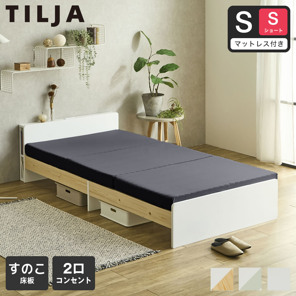 ベッド ティリア すのこベッド 棚付きベッド シングルショート 30D三つ折りブロックウレタンマット付 木製 コンセント【ショートサイズ】ツートンカラー