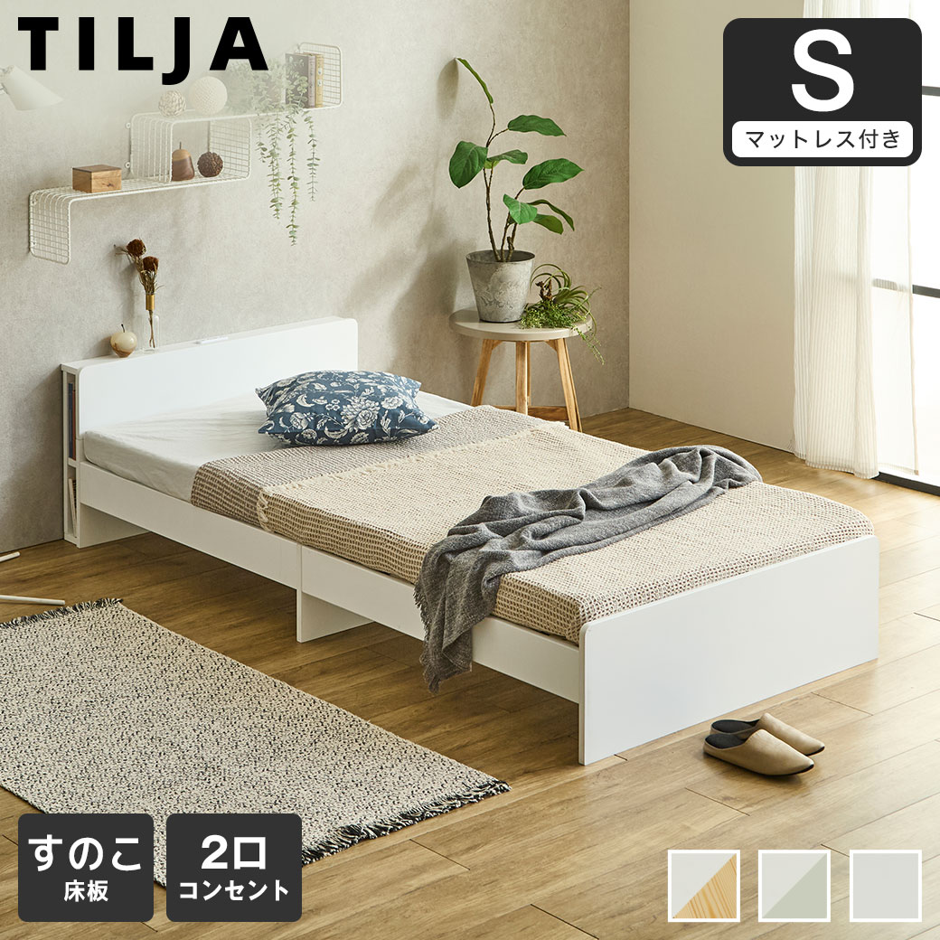 | 当社オリジナルの棚付きすのこベッド「ティリア」。選べる3カラー・清潔感あふれる単色〈ホワイト〉・ツートンタイプはおしゃれな〈ホワイトグレー〉と・やさしい印象の〈ホワイトナチュラル〉お好みやお部屋のテイストに合わせて選べます。ヘッドボードには小物が置ける棚・コンセント付き。スマホの充電に便利。ヘッドのサイドにも棚スペースがあるので、本や小物がすっきり収納できます。床面はスノコ仕様。湿気を逃がしやすく、カビ対策にも◎オールシーズン快適な眠りをサポートします。デザインも使いやすさも快適さも。お部屋になじむシンプルナチュラルな木製ベッドです。 ■保証期間:1年 ■サイズ(約):・ベッド外寸:幅97.5×長さ207.6×高50cm ・ベッド床面有効内寸:幅97.5×長さ195cm ・マットレス外寸:幅97×長195×厚10cm ■材 質:・ベッド:MDF( ラッカー塗装)、LVL 材、※ 天然木パイン材(※カラー:ホワイト×ナチュラルのみ一部パイン材を使用) ・マットレス:中材:ウレタンフォーム、生地:ポリエステル100% ■耐荷重(約):150kg ■組 立:お客様組立品(大人2人約40分) ■生産国:中国 ■梱 包:・ベッド:1個口:(1-1)104×33×23.2cm(35.8kg) ・マットレス:1個口:37×37×52cm(7kg) ■備考:※納期表示の異なる商品を同時に購入した場合、納期の遅い商品とまとめて発送する場合がございます。予めご了承ください。 |
