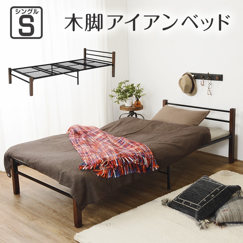 シングルベッド 木製ベッド ベッドフレームのみ単品 アイアンベッド メッシュ床面 天然木 シングル ベット パネル型 KH-3087BK ブラック