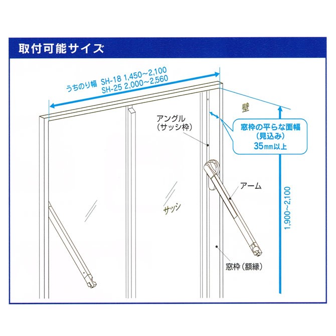 ※取り付け可能サイズ ・取り付けは窓枠があり、窓枠の平らな面幅(見込み)が35mm以上。(見込み部分の推奨は500mm以上 台座がアングルに被らないように取り付けてください) ・窓枠内(うちのり幅)寸法(横)がSH-18:1,450から2,100mm/SH-25:2,000から2,560mm ・適応するサッシの高さは1,900〜2,100mm です。・ロールスクリーンやブラインド等のある窓枠へ取り付ける場合は、取付位置によっては接触する場合があります。施工の際は竿の動き等を確認の上、取付位置を決めて下さい。