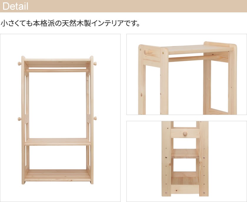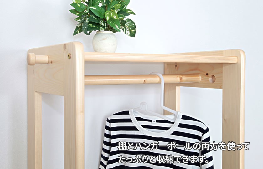 棚やフック、ハンガーバーなどでたっぷり収納でき、通園や通学に必要な物を一か所にまとめられます。サイズは小さくても使いやすいデザインや素材にこだわった本格派。時間が経つほどに変化していく天然木をぜいたくに使い、安全性にも配慮した丁寧な仕上げです。飽きずに長く使えるシンプルなハンガーラックは、インテリアとしてトータルコーディネートもしやすく、シリーズで揃えれば統一感のお部屋作りもできます。