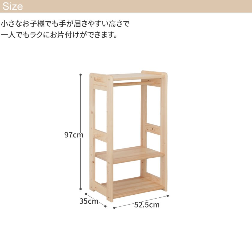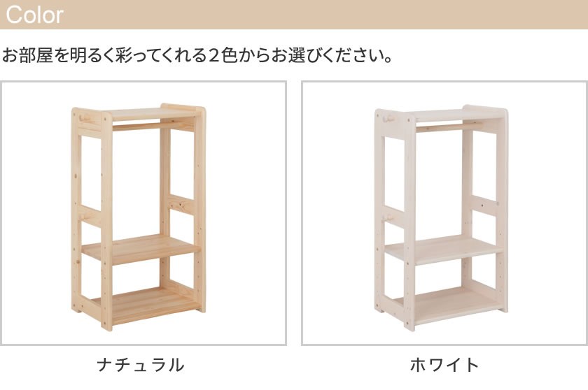 | 成長しても使える天然木パイン材使用した子ども家具シリーズ。 ・ハンガーバーの位置は前後が選べます。 ・ハンガーバーを前側にすることで、大人用ハンガーに対応。子供が大きくなっても使えます。 ・脚裏にはクッションが付きます。床に傷が付くのを防ぎます。 ・フックはうれしい4個付きです。 ■サイズ(約):幅52.5×奥行35×高さ97cm 内寸: ◎幅:48.5cm ◎可動棚奥行:32.5cm ◎床から天板高さ:95cm(他の棚板は任意の位置) ◎可動棚:7cmピッチ・5段階 ◎床からハンガーバーまでの高さ:87cm ◎床からフック(下)までの高さ:49.5cm ◎フック(下)からフック(上)までの高さ:44cm ■材質:パイン材(ラッカー塗装) ■耐荷重(約):棚板:各5kg ハンガーバー:3kg フック:各0.5kg ■お客様組立品 ■ベトナム製 ■重量(約):8.5kg ■梱包:1個口 重量:約9.5kg サイズ:100.4×38.4×10cm ■備考: 【天然木の特徴(必ずお読みください)】 ・木材自体が持っている節、黒い木目のライン、青色の筋状の模様などが入っている部分があります。なるべく目立たないような場所に、使用するなどの努力はしておりますが、皆無にする事はできません。さらに、節、木目等は一様ではなく個々の商品により異なります。 ・目立つ節、キズ等には必要な補修をしている場合があります。そのため補修跡が残る場合があります。 ・材料のロットの違い等により板どうしの色合いに違いがある場合があります。 ・天然木は温度・湿度等の条件により伸縮を繰り返します。この為、部材と部材の間にすき間が生じる場合があります。 【組み立て方】 ※棚板は任意の位置に設定できますが、上段は一番上の位置に設置してください。 ※棚板は必ず3枚取り付けてください。 |