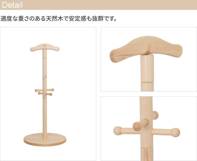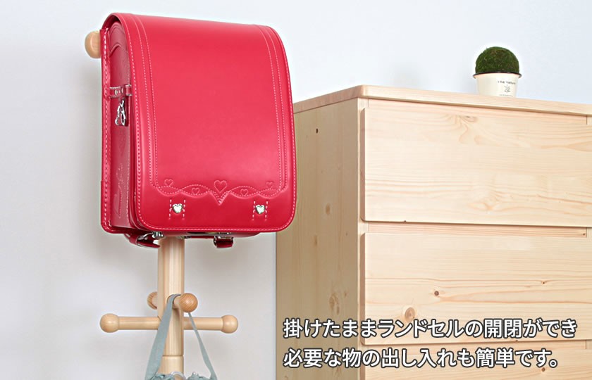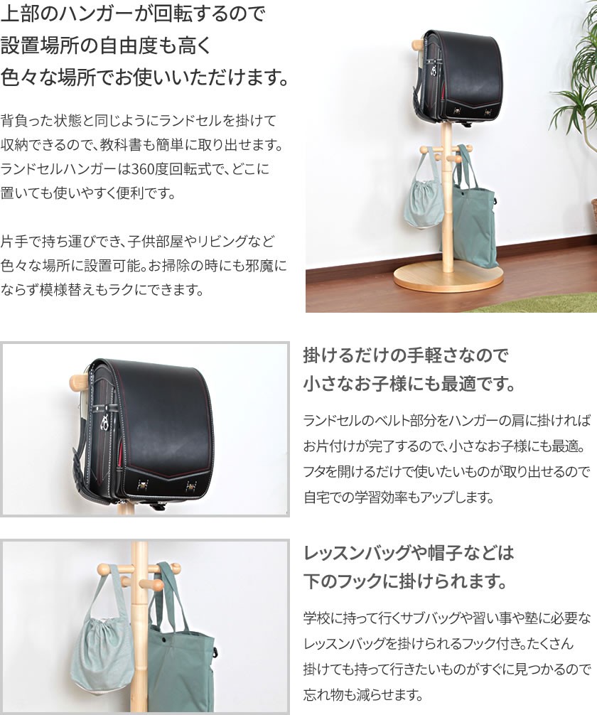 肌触りが滑らかで時間とともに風合いが増していく天然木は、適度な重さがあるので安定感も抜群です。どこに置いても馴染むシンプルなデザインなので、お子様の成長後も洋服やバッグなどを掛けるハンガーポールとしてお使いいただけます。学校から帰ってきたらランドセルを掛けるだけなので、お子様も楽しく片付けができて机の上やリビングもすっきり。フックやハンガーの先は丸く仕上げてあるので、万が一のケガも予防できます。