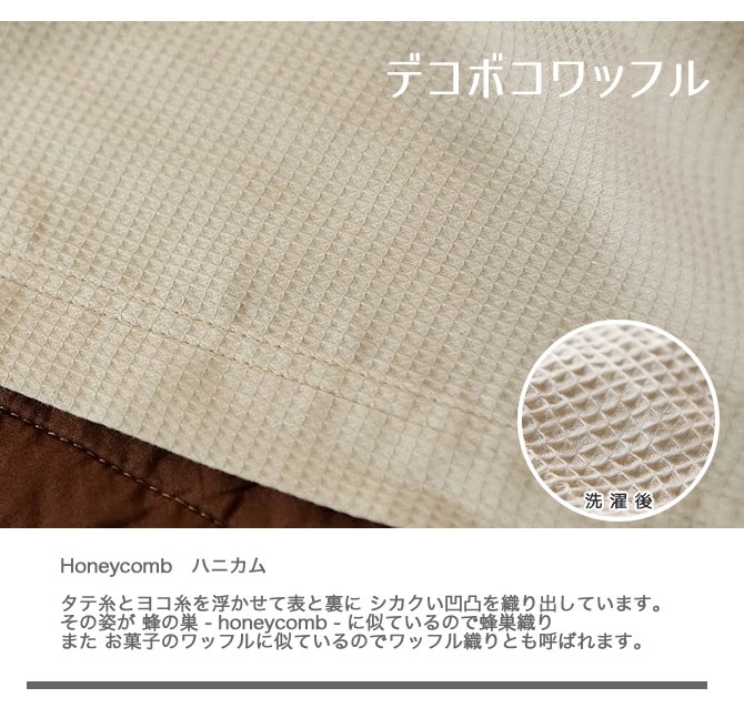 お洗濯を重ねるとワッフルの凸凹がより強調される感じです。ヨコ糸に使った60番コーマ糸のさわり心地は洗濯しても変わらずサラッと心地よい肌ざわりが1年中楽しめるファブリックです。