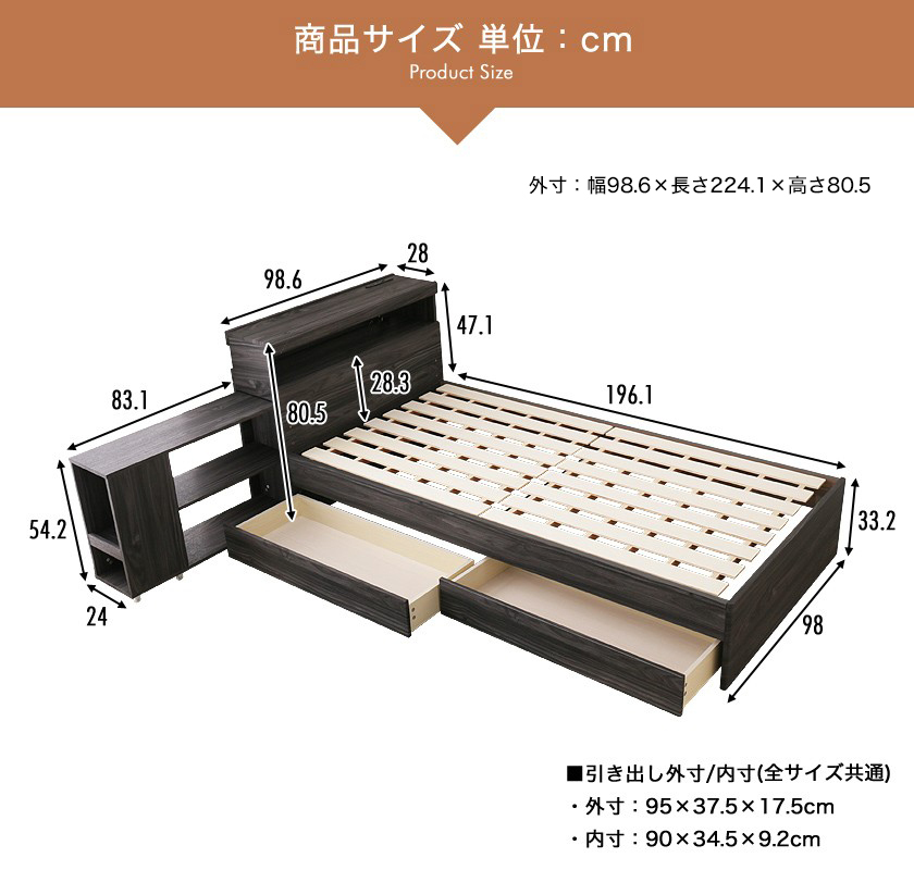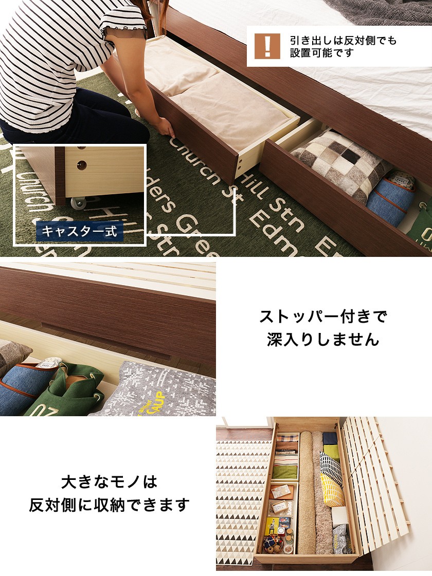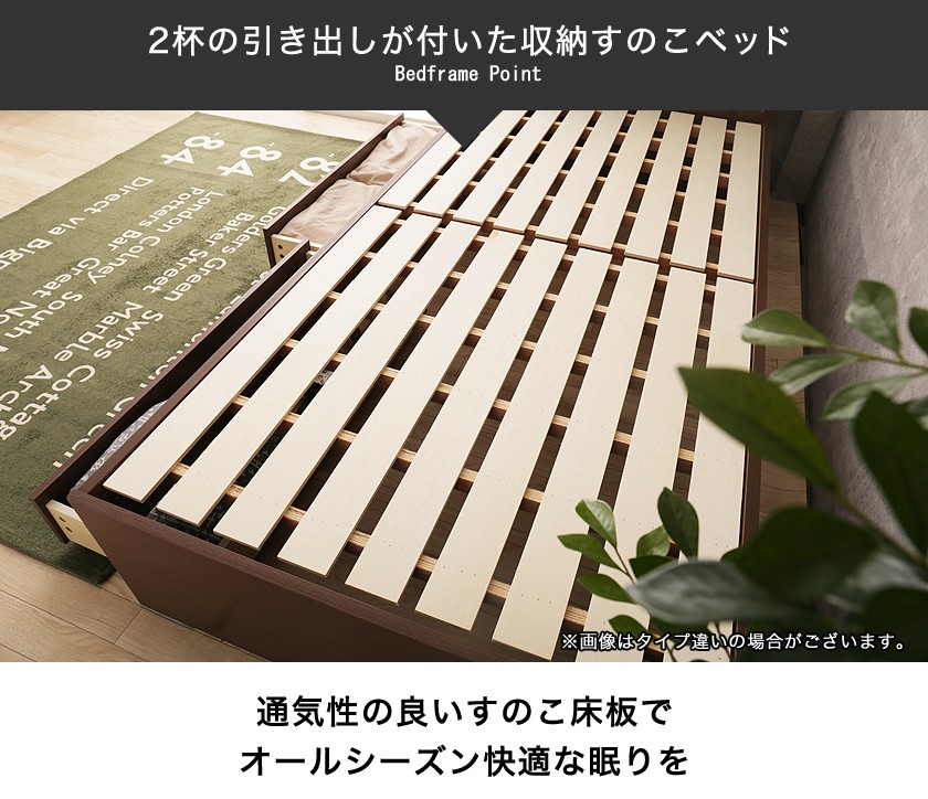 床面がすのこ仕様のため、通気性が良く、オールシーズンさわやかに眠ることが出来ます。2杯の引き出しは衣類や寝具、小物等をしまっておくのに便利です。引き出しはキャスター式のため、完全に取り出してモノを収納することが出来ます。