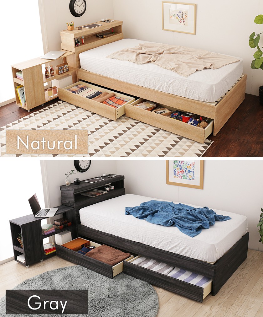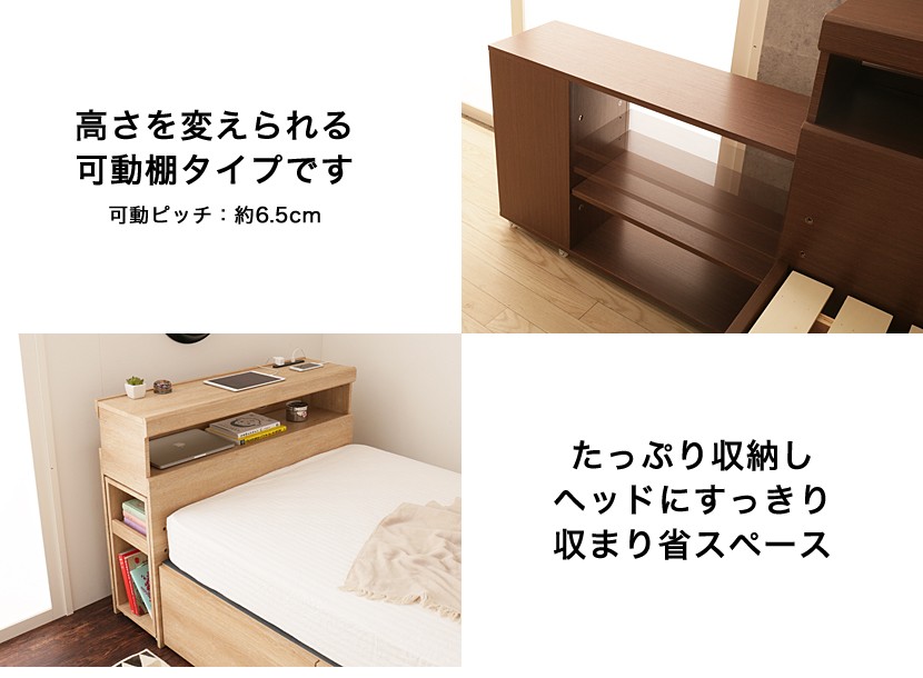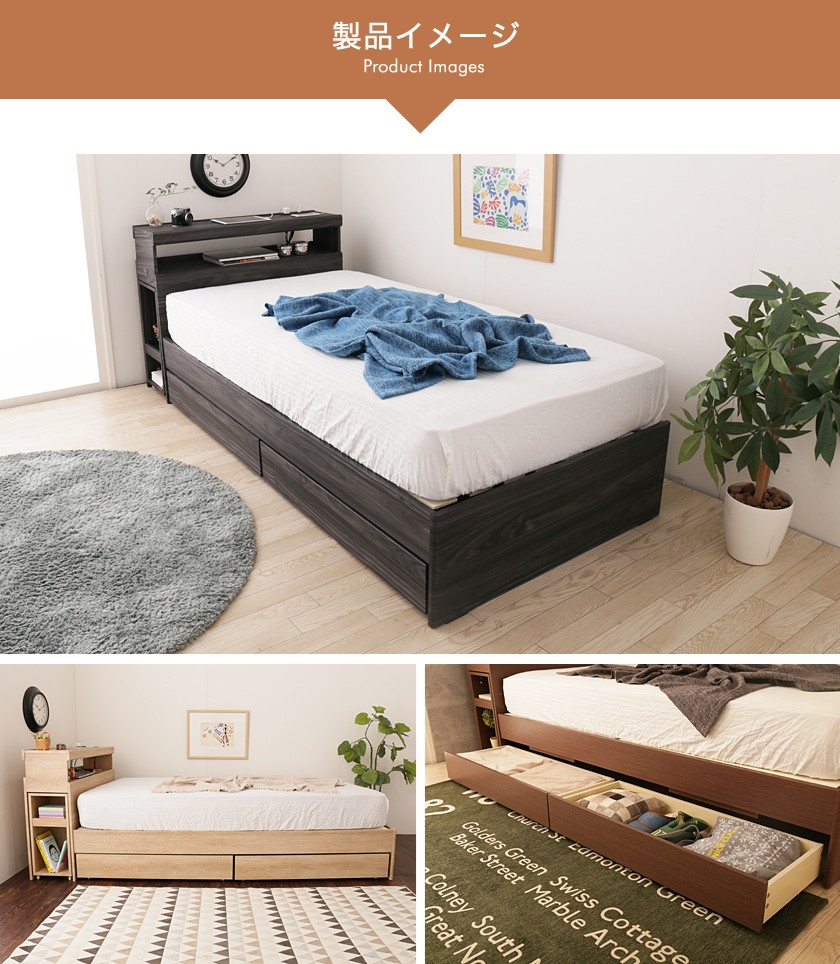 引き出し付きすのこベッドにオープンシェルフ付き宮棚ヘッドを組み合わせ、モダンなデザインで仕上げた、当社オリジナルの木製収納ベッド"Wanda"シングルサイズ。