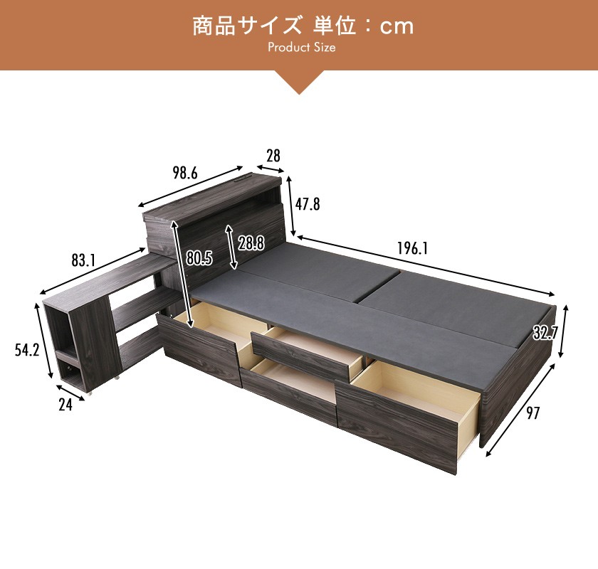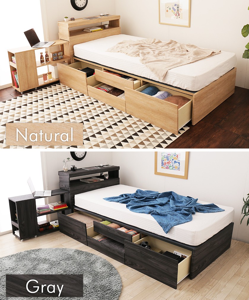 大収納チェストベッドにオープンシェルフ付き宮棚ヘッドを組み合わせ、モダンなデザインで仕上げた、当社オリジナルの木製チェストベッド"Wanda"シングルサイズ。