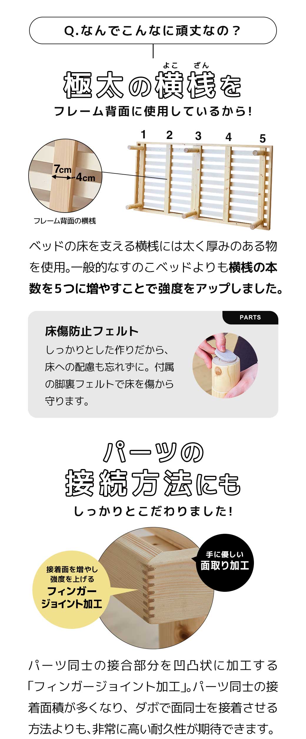 | ※本ページは厚さ20cmポケットコイルマットレスとのセット販売ページです。 ■サイズ(約): ・ベッド外寸:幅80×長さ195×高さ31.5cm ・各脚タイプ高さ別床面高:5.5/11.5/25.5/31.5cm ・マットレスサイズ:幅80×長さ195×厚さ20cm ■材質: ・ベッド:天然木パイン材(ラッカー塗装)、・ベッド:天然木積層合板 ・マットレス表面:ポリエステル100%(ニット織、テイジンマイティトップ2抗菌防臭防ダニわた入り)、3Dメッシュ/中材:ポケットコイル、ウレタン、白色ピュアフェルト ■耐荷重(約):350kg ■組立:組立品(大人1人15分) ※組立に必要な工具は付属しています。 ■生産国:中国製 ■梱包:・ベッド梱包数:1個口 ・ベッド梱包サイズ:82×101.5×13cm(20.5kg) ・マットレス梱包数:1個口 ■備考: 【NA】【WH】【BR】 ・床キズ防止フェルト付き ※設置や移動の際は必ず2人以上でフレーム長辺の中心を支えて持ち上げてください。 |