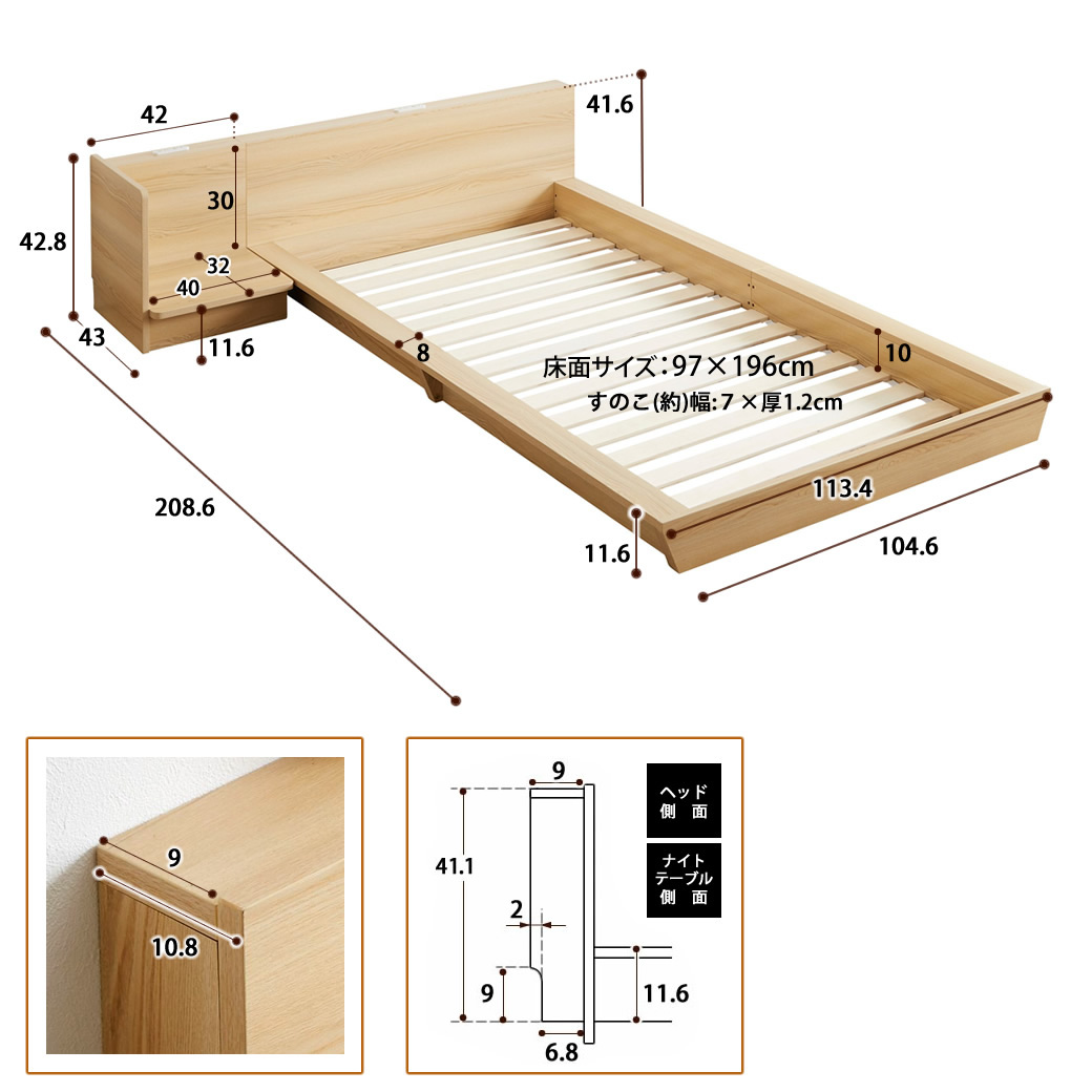 | プラットフォームベッド シングル&ナイトテーブルR(右) ベッドフレーム+ナイトテーブル(右) 棚・コンセント付き 高さを抑えたロースタイルベッド。お部屋にゆとりと開放感のある空間を演出。便利ながらも圧迫感を与えない、スリムな奥行きの宮棚です。棚にはホコリが入りにくいスライド式コンセントが2口。スマホ等の充電に使用できます。ナイトテーブルにもコンセント付き。スッキリとした直線的なデザイン。きれいな木目調のベッドフレーム マットレスは別売です。 ■サイズ(約):ベッドフレーム:幅113.4×奥行208.6×高41.6cm 床面サイズ:97×196cm ナイトテーブル:幅42×奥行30×高42.8cm (※設置時の幅はフレーム幅とナイトテーブルの幅の合計となりますのでご注意ください) ■材質:ベッドフレーム:MDF( メラミン化粧繊維板 )、LVL ナイトテーブル:MDF( メラミン化粧繊維板 ) ■耐荷重(約):150kg ■組立:お客様組立品(大人2人40分) ■生産国:中国 ■梱包:(個口数3:約)3-1)105.5×34.5×17(18.3kg) 3-2)116.5×34×7(12.1kg)(cm) 3-3)104×43.5×8(9kg)(cm) ■備考: コンセントAC100V ※組立にプラスドライバーが必要です。 【BR】【NA】【WH】【GY】 |