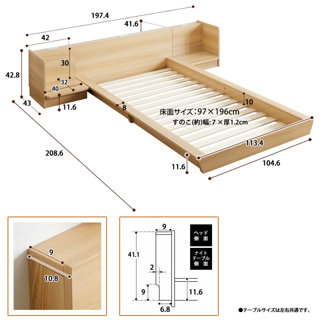 | プラットフォームベッド シングル&ナイトテーブル L-R(左右) ベッドフレーム+ナイトテーブル(左右) 棚・コンセント付き 高さを抑えたロースタイルベッド。お部屋にゆとりと開放感のある空間を演出。便利ながらも圧迫感を与えない、スリムな奥行きの宮棚です。棚にはホコリが入りにくいスライド式コンセントが2口。スマホ等の充電に使用できます。ベッドフレームのヘッドボードの左右に設置できるナイトテーブルにもコンセント付き。スッキリとした直線的なデザイン。きれいな木目調のベッドフレーム ベッドサイドテーブル付き マットレスは別売です。 ■サイズ(約):ベッドフレーム:幅113.4×奥行208.6×高41.6cm 床面サイズ:97×196cm ナイトテーブル:幅42×奥行30×高42.8cm(×2) (※設置時の幅はフレーム幅とナイトテーブルの幅の合計となりますのでご注意ください) ■材質:ベッドフレーム:MDF( メラミン化粧繊維板 )、LVL ナイトテーブル:MDF( メラミン化粧繊維板 ) ■耐荷重(約):150kg ■組立:お客様組立品(大人2人40分) ■生産国:中国 ■梱包:(個口数4:約)4-1)105.5×34.5×17(18.3kg) 4-2)116.5×34×7(12.1kg) 4-3)104×43.5×8(9kg) 4-4)104×43.5×8(9kg)(cm) ■備考: コンセントAC100V ※組立にプラスドライバーが必要です。 【BR】【NA】【WH】【GY】 |
