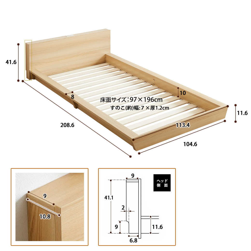 | プラットフォームベッド シングル&20cm厚 neruco 高密バリューポケットコイルマットレス付 棚・コンセント付き 高さを抑えたロースタイルベッド。お部屋にゆとりと開放感のある空間を演出。便利ながらも圧迫感を与えない、スリムな奥行きの宮棚です。棚にはホコリが入りにくいスライド式コンセントが2口。スマホ等の充電に使用できます。 スッキリとした直線的なデザイン。きれいな木目調のベッドフレーム マットレスセット。(ナイトテーブル無しタイプの販売ページです) ■サイズ(約):ベッドフレーム:幅113.4×奥行208.6×高41.6cm 床面サイズ:97×196cm マット:幅97×長さ195×厚20cm ■材質:ベッドフレーム:MDF( メラミン化粧繊維板 )、LVL マット:表面生地:ポリエステル100% 、ニット織 側面生地:3Dメッシュ 中材:ポケットコイル、ウレタン、白色ピュアフェルト コイル線径:2.0mmコイル巻数:5.5巻、コイル鋼線種:SWRH72B ■耐荷重(約):150kg ■組立:お客様組立品(大人2人40分) ■生産国:中国 ■梱包:ベッド:2個口 2-1)105.5×34.5×17(18.3kg) 2-2)116.5×34×7(12.1kg)(cm) マットレス:1個口※衛生・コンパクト、圧縮梱包でお届けいたします。 ■備考: コンセントAC100V ※組立にプラスドライバーが必要です。 【BR】【NA】【WH】【GY】 |
