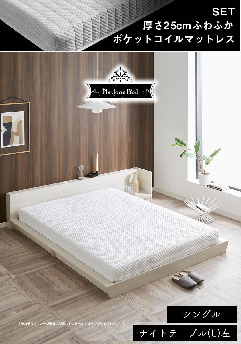 | ●Platform Bed シングル ■フレームのみ ベッド/ ベッド+ナイトテーブルR(右)/ ベッド+ナイトテーブルL(左)/ ベッド+ナイトテーブルLR(左右) ■15cm厚ポケットコイルマットセット ベッド/ ベッド+ナイトテーブルR(右)/ ベッド+ナイトテーブルL(左)/ ベッド+ナイトテーブルLR(左右) ■20cm厚ポケットコイルマットセット ベッド/ ベッド+ナイトテーブルR(右)/ ベッド+ナイトテーブルL(左)/ ベッド+ナイトテーブルLR(左右) ■25cm厚ポケットコイルマットセット ベッド/ ベッド+ナイトテーブルR(右)/ ベッド+ナイトテーブルL(左)/ ベッド+ナイトテーブルLR(左右) |