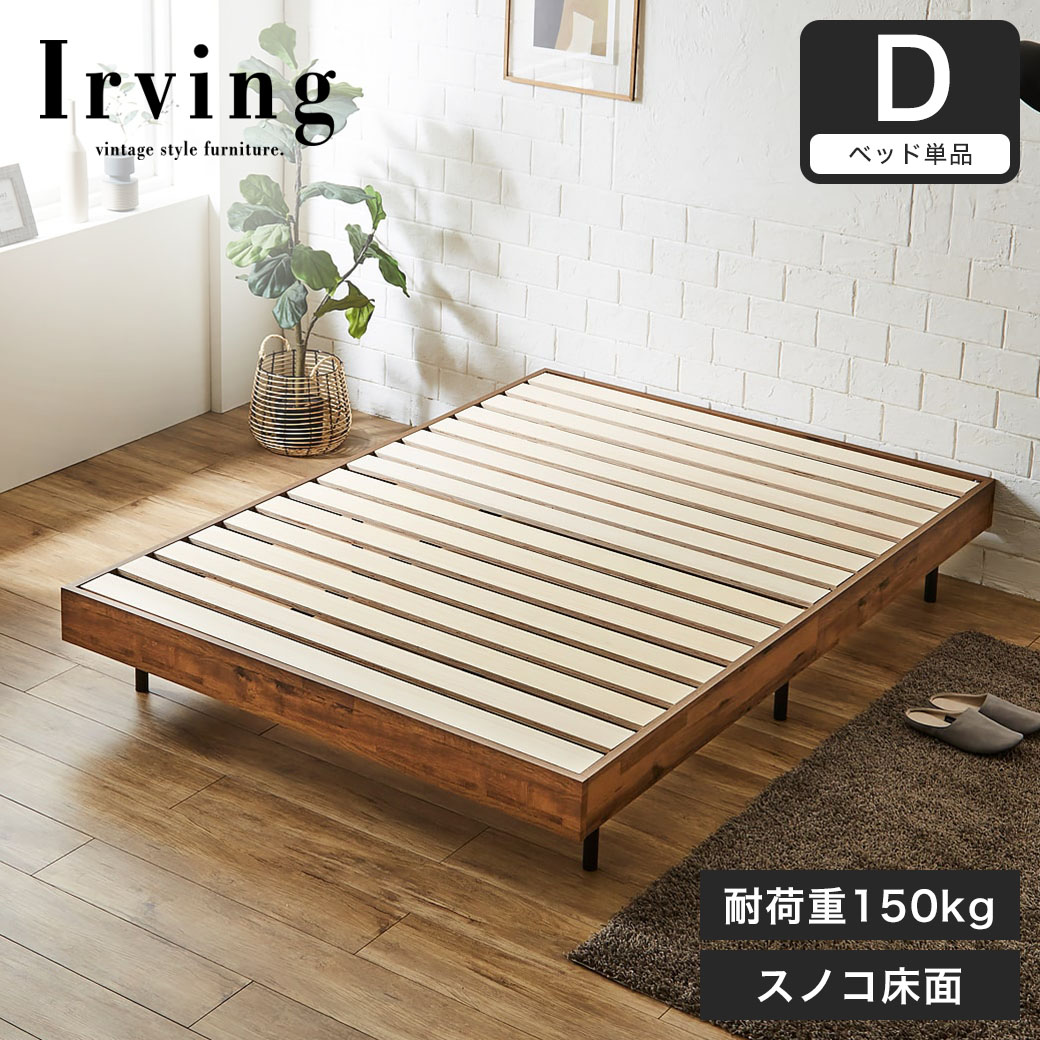 当社オリジナルの木製ベッド「アーヴィング」。味わい深い表情の木目と武骨なアイアン脚が合わさった、ヴィンテージ調のベッドです。