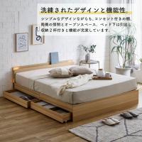 ヘッドボードには左右それぞれ自由に点灯できる(対象:ダブル、クイーン)優しい照明と、スマホやタブレットを立てかけて置いたり、小物などを置いておくことのできる便利なコンセント付きの棚。両サイドには雑誌などを収納できるオープンスペースも付いて機能性抜群。ベッド下のデッドスペースは、キャスター付きの便利な引出し収納2杯でしっかり有効活用。床板はすのこ仕様で通気性抜群、床面に溜まりがちな湿気を逃がして快適な睡眠環境に。フレームには木目調のメラミン樹脂シートを使用、汚れや粘着、傷に強く、お手入れ簡単で長く綺麗にお使い頂けます。