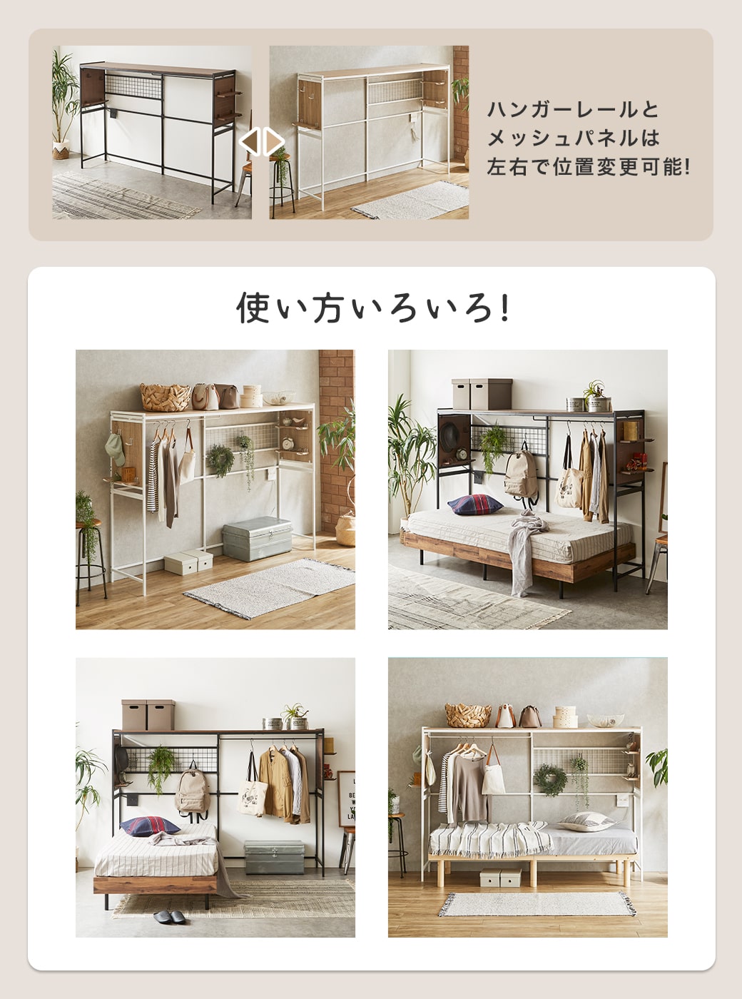 | 今まで空いていたベッド上の空間を収納スペースとして有効活用できるシェルフ、 All in Shelf。 シェルフには多くの収納機能があります。有孔ボードやメッシュパネルで自由自在な収納アレンジ。お気に入りの服をたくさん掛けられるハンガーレール。 付属品として有孔ボードに設置できる可動棚やフックが付いています。ベッドは縦置き、横置きどちらでもOK!ベッド周りのレイアウトも自由自在です。 また、可動式のコンセントユニットを備え、電気製品の置き場所に困ることなく、効率的な使用が可能です。 ■保証期間:1年 ■サイズ:幅214×高さ149×奥行50cm ■材 質:スチール、MDF(シート貼り) ■組 立:お客様組立品(大人2人約60分) ■生産国:マレーシア ■梱 包:1個口:115×56×21.5cm(34.1kg) ■備考:ベッドの長さや幅によっては本製品の下に設置できない可能性がございますので、ご購入の前にサイズの確認をお願いいたします。 |