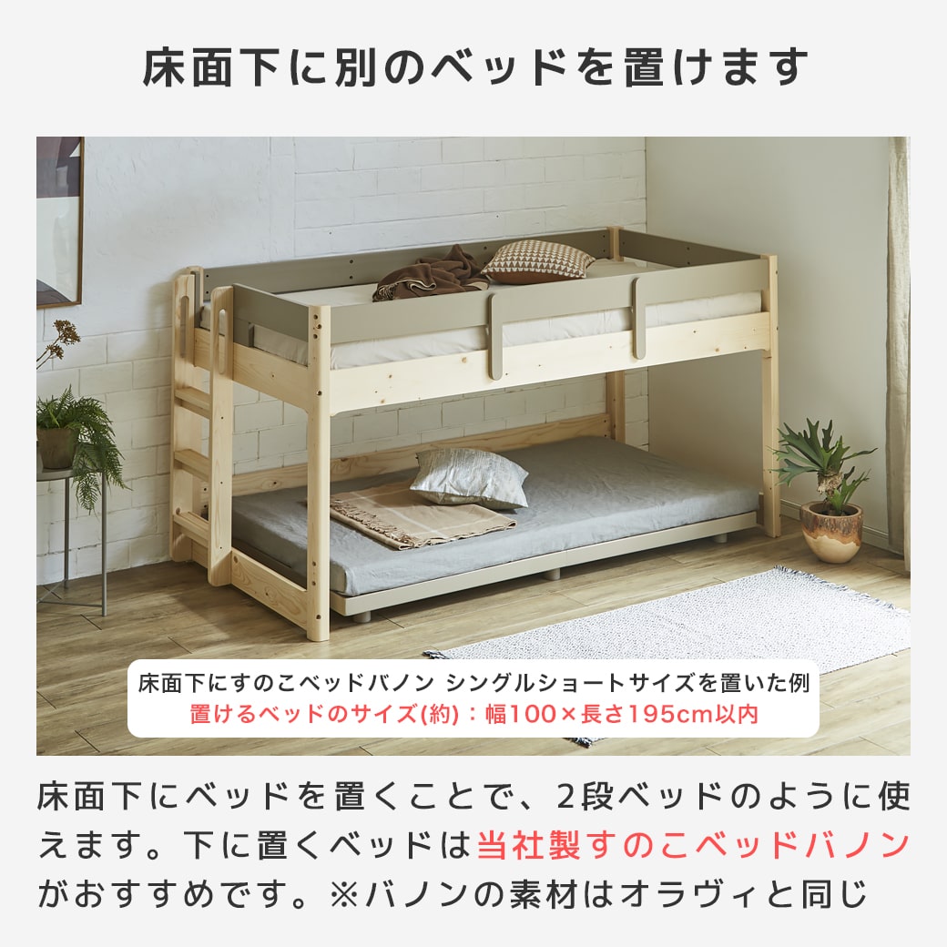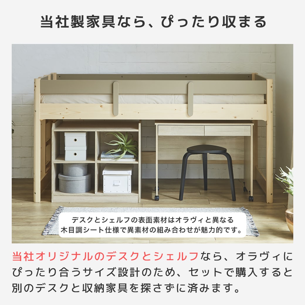 | 当社オリジナルの木製ロフトベッド「オラヴィ」 異なるカラーを組み合わせた明るく楽しいデザインでお部屋をパッと華やかに演出します。 お気に入りの空間で過ごすことで、自立心を育み、毎日の学習時間もより楽しくなるはず。シンプルなデザインのため、大人の一人暮らしやワンルームにもマッチします。 安全面にもこだわり、角を丸く加工した安心設計。小さなお子さまが使ってもケガの心配を減らし、親御さんも安心です。 さらに、頑丈な構造で長く使える耐久性を備えているので成長期のお子さまにもおすすめ。 スペースを有効活用できる省スペース設計の垂直ハシゴは、子供部屋や一人暮らしのお部屋でもすっきり。ベッド下は収納やデスクスペースとして活用できるので、限られた空間を賢く使えます。 「子供 ロフトベッド」「キッズベッド」「一人暮らし ロフトベッド」をお探しの方に最適な一台です。 ■保証期間:1年 ■サイズ(約):・ベッド外寸:幅105.5×長さ214.5×高さ110cm ・ベッド床面有効内寸:幅97.5×長さ201cm ・ベッド床面高:81cm ・デスク:幅85×奥行50×高70cm ・シェルフ:幅85×奥行50×高70cm ■材 質:・ベッド:天然木パイン材(ラッカー塗装)、LVL ・デスク/シェルフ:パーティクルボード ■耐荷重(約):250kg ■組 立:お客様組立品(大人2人約80分) ※組立の際プラスドライバーをご用意ください。 ドライバーは、付属のネジに合ったサイズのものを使用してください。 ■生産国:ベッド:中国/デスク&シェルフ:マレーシア ■梱 包:・ベッド:4個口:(4-1)118×16×12cm(6.5kg)(4-2)201×33×11cm(21.4kg)(4-3)110×37.5×9cm(3.3kg)(4-4)104×99×6cm(14kg) ・デスク:1梱包:(1-1)92×54.5×9.5cm(20.7kg) ・シェルフ:1梱包:(1-1)89.5×54.5×11.5cm(26.5kg) ■備考:【MONA】【NANA】【WHNA】 |
