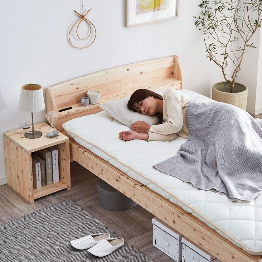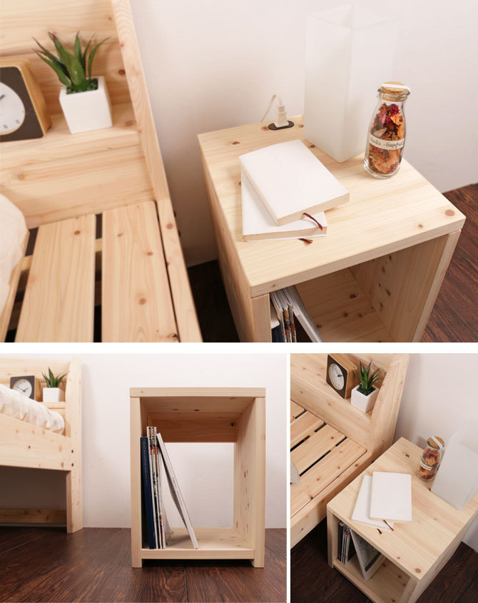 雑誌などを置ける小棚付きで、枕元の収納としてもお使いいただけます。無塗装なので、ひのきが爽やかに香ります。