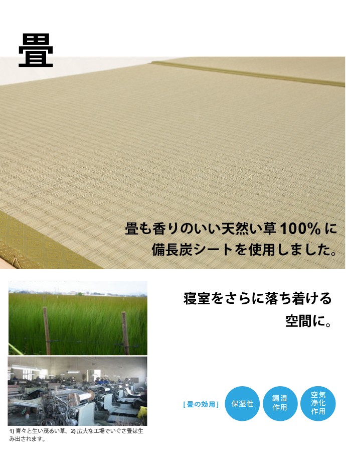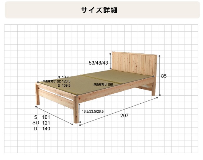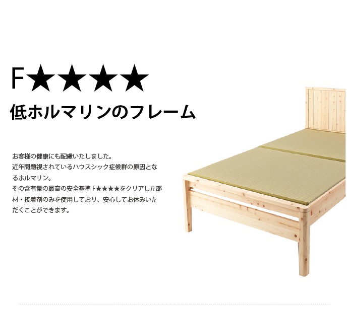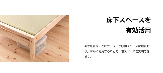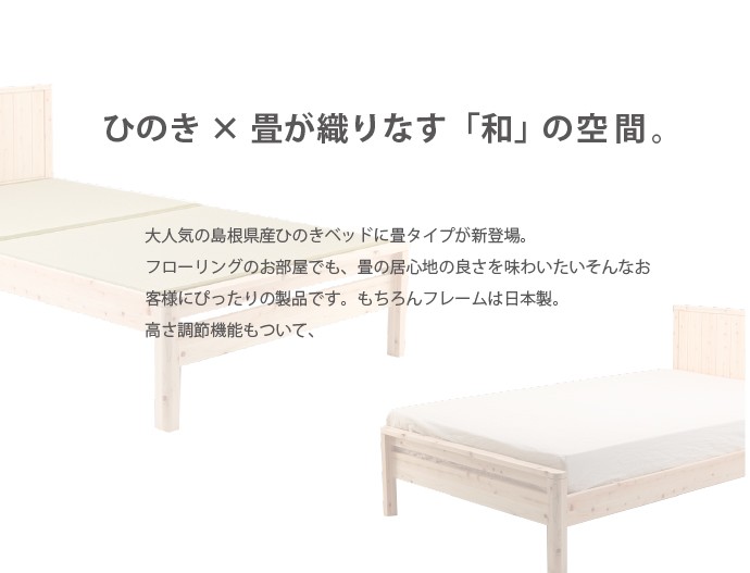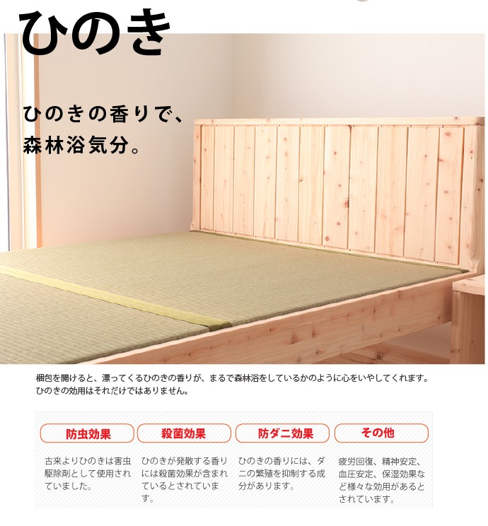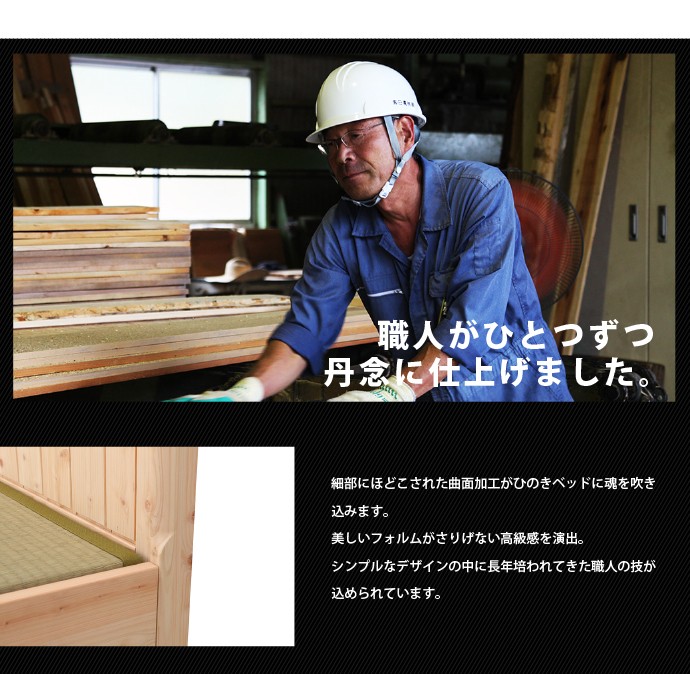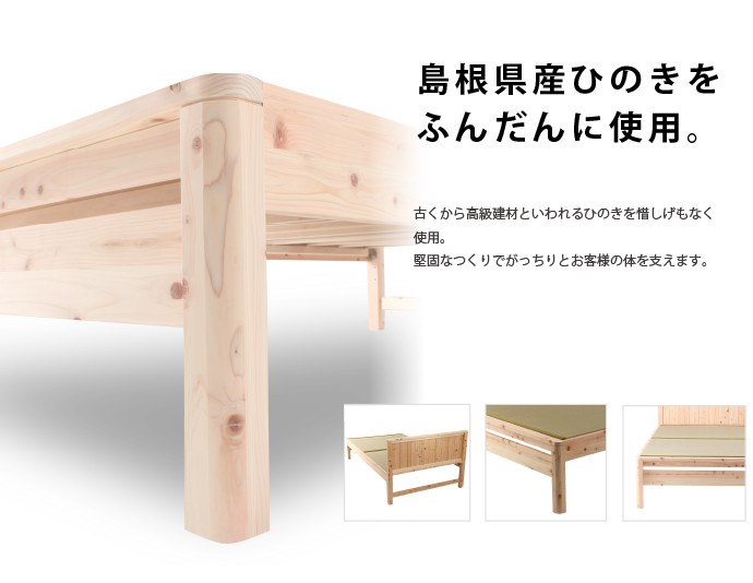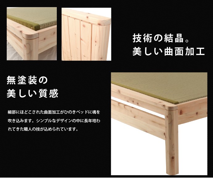 | フローリングのお部屋でも、畳の居心地の味わいつつ、ゆったりと和みたい。モダンデザインの国産檜の畳ベッドフレームです。高級建材ひのきとい草はもちろん日本製。細部に施された曲面加工をはじめ、日本の職人のこだわりが光る一品です。 ■サイズ(約): ベッド本体 幅121×長さ207×高さ85cm 床面有効寸法 幅120.5×長さ196cm 床面高:32/37/42(床面下高さ18.5/23.5/28.5)cm ■材 質: ベッド本体:ひのき天然木(無塗装) 畳材質:い草、床板/合板 ■耐荷重(約):約100kg ■組立:お客様組立品(2名約30分) ■生産国:日本製 ■備考: |