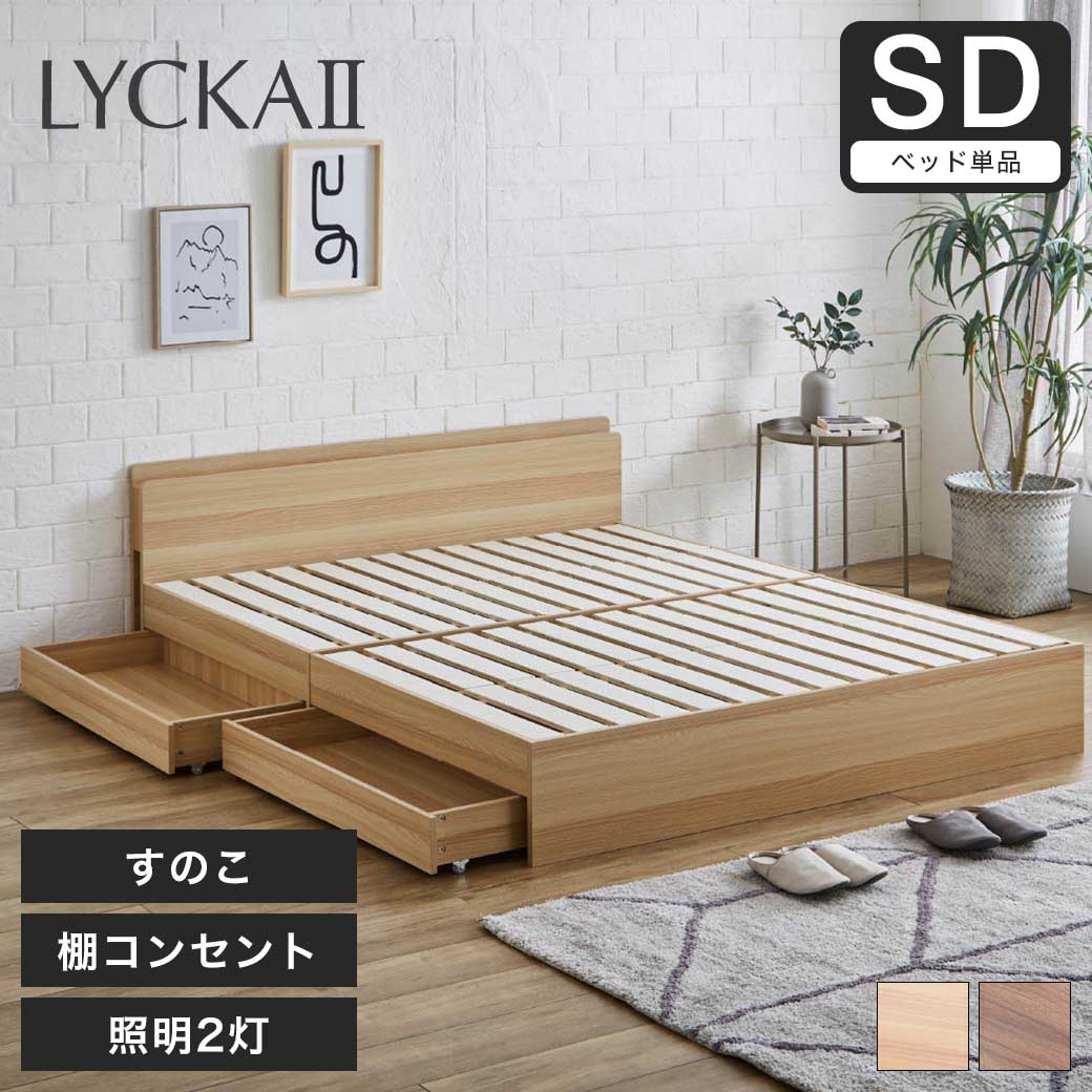 | ヘッドボードには左右それぞれ自由に点灯できる(対象:ダブル)優しい照明と、スマホやタブレットを立てかけて置いたり、小物などを置いておくことのできる便利なコンセント付きの棚。両サイドには雑誌などを収納できるオープンスペースも付いて機能性抜群。ベッド下のデッドスペースは、キャスター付きの便利な引出し収納2杯でしっかり有効活用。床板はすのこ仕様で通気性抜群、床面に溜まりがちな湿気を逃がして快適な睡眠環境に。フレームには木目調のメラミン樹脂シートを使用、汚れや粘着、傷に強く、お手入れ簡単で長く綺麗にお使い頂けます。 ■サイズ(約): ベッド本体: 幅120×長さ204.1(床板長さ196)×高さ58(床面高26.3)cm 引出し外寸/内寸: 幅95.4(88)×長さ41.6(38.4)×高さ11.8(9.4)cm 棚部寸法: 有効幅116.2×奥行8.1(有効奥行4.5)cm ■材質: ベッド本体: メラミン樹脂シート張り化粧板、合板 ※第三者機関による3000N(300kgf)の荷重試験に合格。 耐荷重はおよそ150kgを目安にお使いいただけます。 ■耐荷重(約):約150kg ■組立:お客様組立品(2名約60分) ■使用工具:プラスドライバーをご用意ください。 ■生産国:中国製 ■梱包:・梱包サイズ: 1:幅123×奥行64×高さ13cm 2:幅105×奥行42×高さ13.5cm 3:幅117.9×奥行49×高さ15.1cm ■備考: 1500W、2口コンセント×1(※ダブルは、2口コンセント×2)、10W白熱球灯2個 |