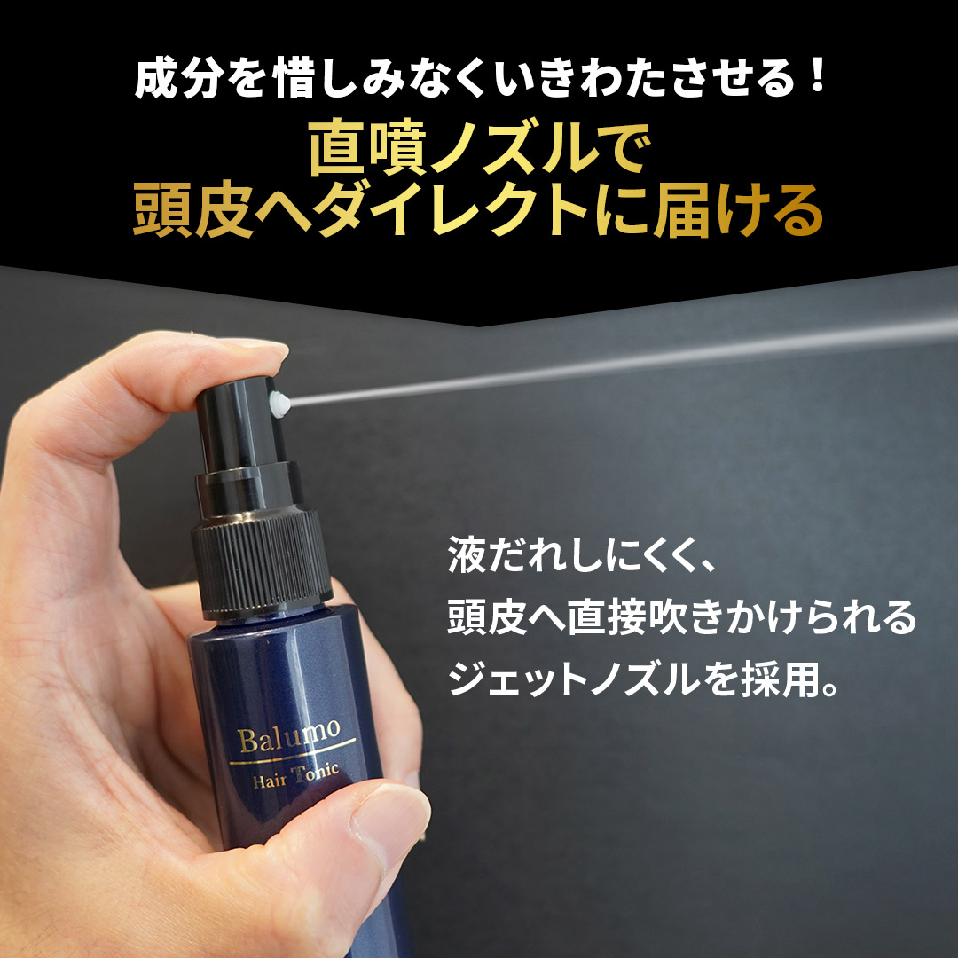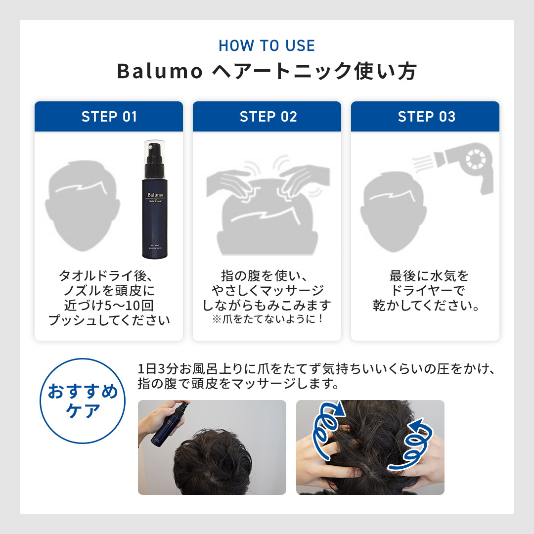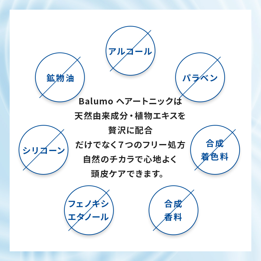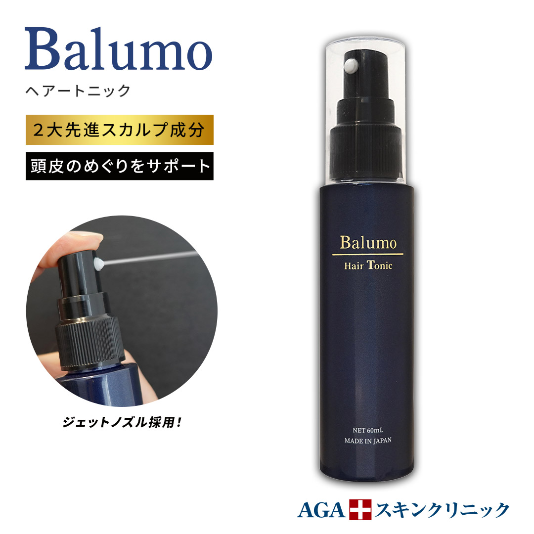 | 特徴 | 頭皮に直接塗布ができ、毛髪・頭皮全体の保湿・保護補修が可能なクリニック監修「Balumo」シリーズ。 最先端治療を全国で専門的に行っているクリニック「AGAスキンクリニック」(全国50院以上、外来実績33万人)が監修した、天然成分をふんだんに使用したオリジナルヘアートニック(頭皮用化粧水)です。 |