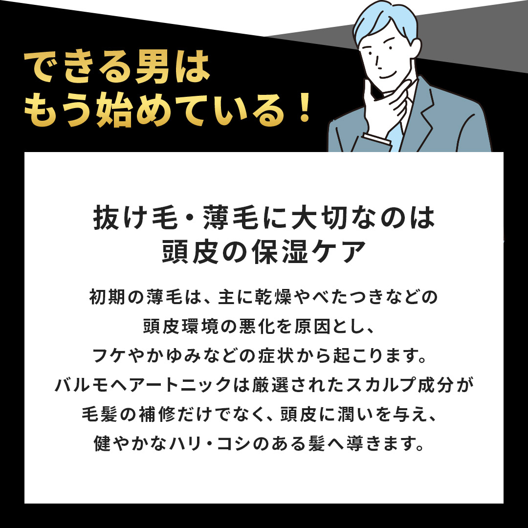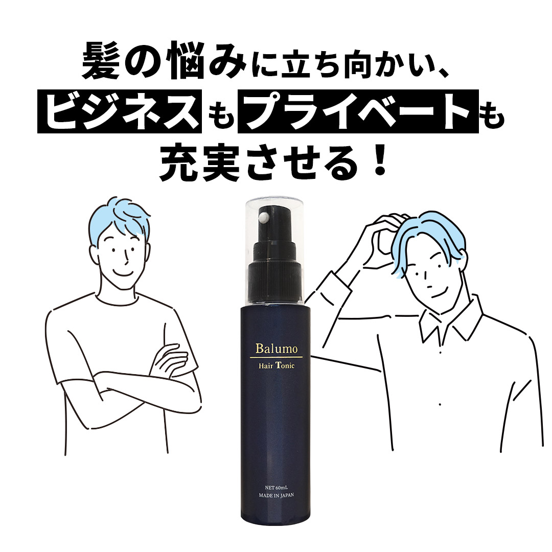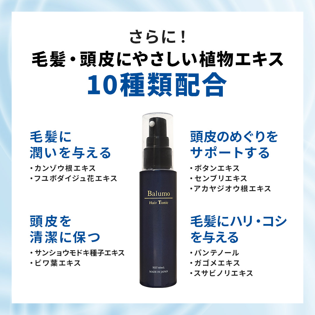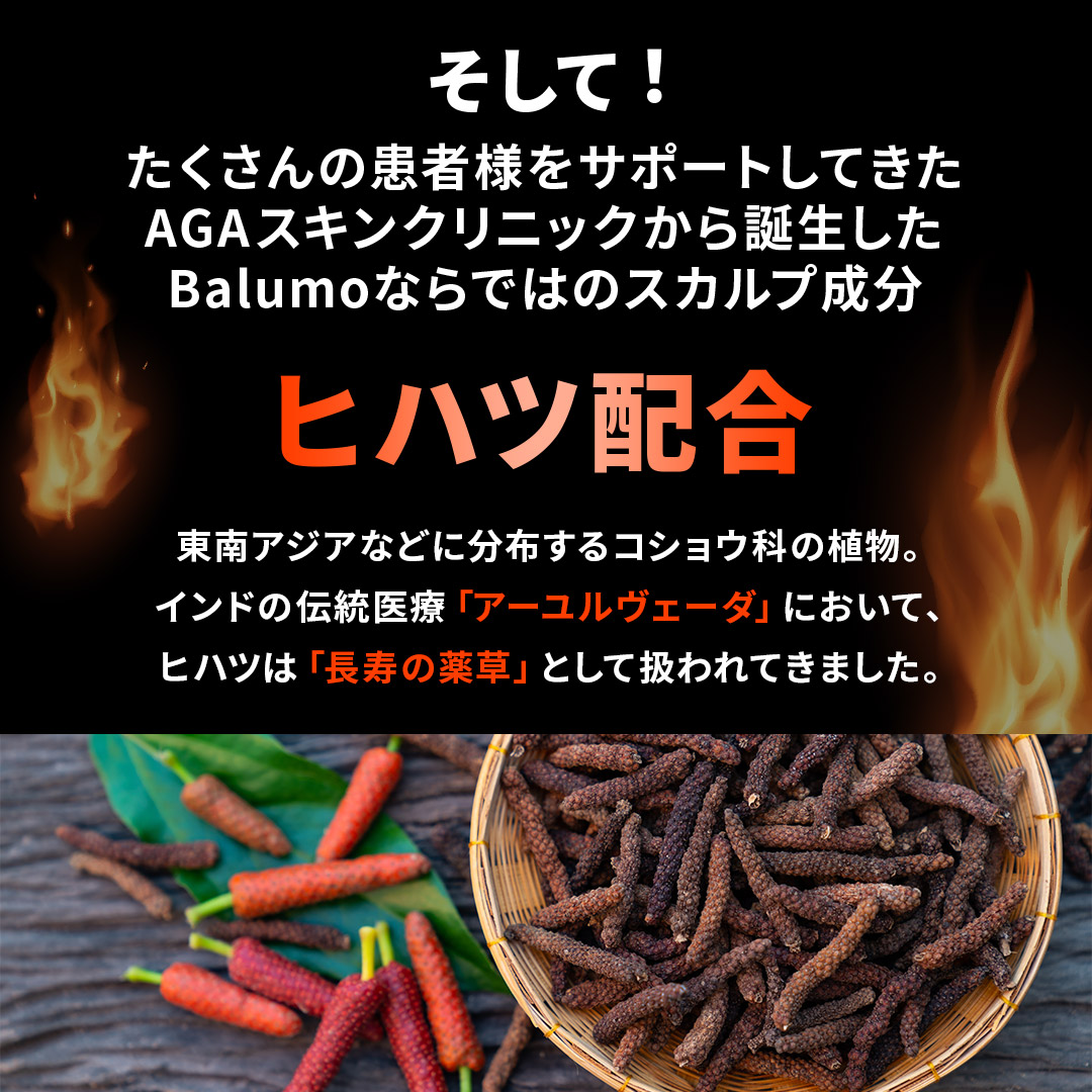 | 特徴 | 頭皮に直接塗布ができ、毛髪・頭皮全体の保湿・保護補修が可能なクリニック監修「Balumo」シリーズ。 最先端治療を全国で専門的に行っているクリニック「AGAスキンクリニック」(全国50院以上、外来実績33万人)が監修した、天然成分をふんだんに使用したオリジナルヘアートニック(頭皮用化粧水)です。 |