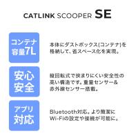 | 商品名 | 自動ネコトイレ CATLINK SCOOPER SE | | サイズ(約) | 幅59.9×奥53.5×高54.4cm 【入り口までの高さ】19cm 【入り口のサイズ】幅21×高22cm 【ドーム内の広さ】幅44.8×奥32×高36.6cm | | 重量(約) | 11kg | | 容量(約) | 【コンテナ】最大容量7L | | 材質 | ポリプロピレン | | 付属品 | 専用ライナー×1ロール、専用デオドライザー×1、アダプター×1、専用ドームメッシュ(粗目)×1、専用ドームメッシュ(細目)×1、消臭ジェル×1 | | 生産国 | 中国(企画・デザイン/中国) | | メーカー | Shanghai catlink intelligence co.ltd |