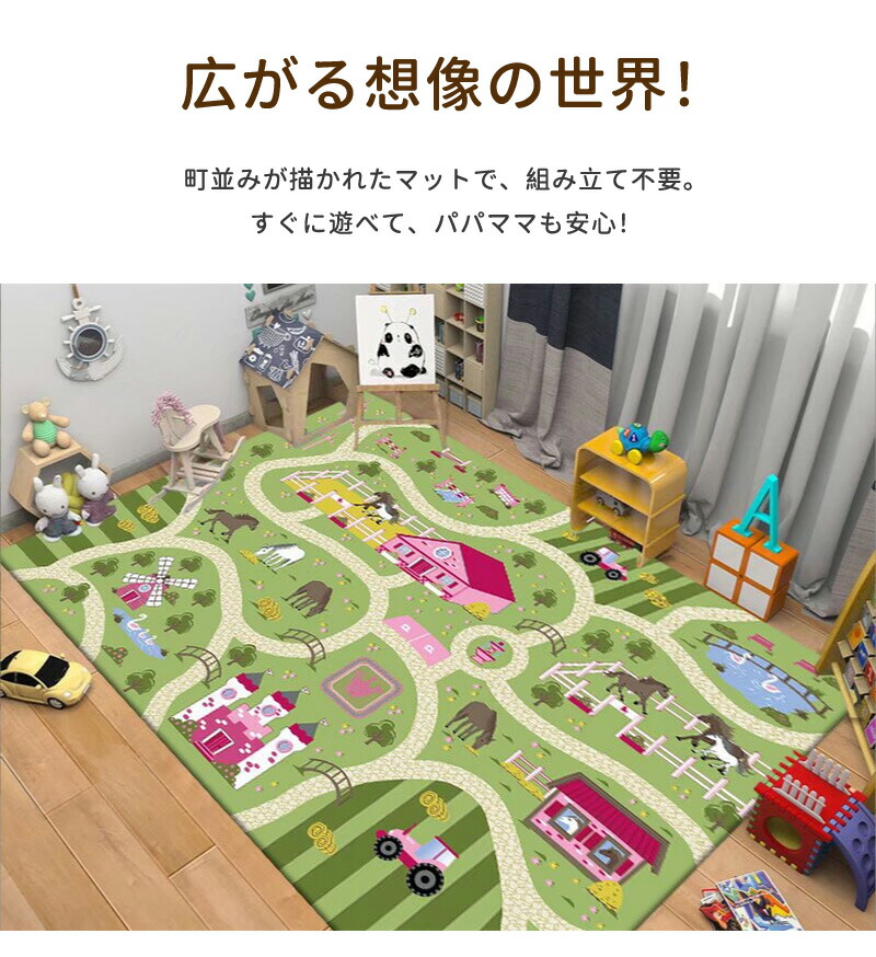 広がる想像の世界!町並みが描かれたマットで、組み立て不要。すぐに遊べて、パパママも安心!