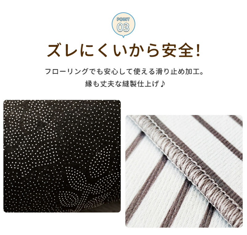 ズレにくいから安全!フローリングでも安心して使える滑り止め加工。縁も丈夫な縫製仕上げ♪