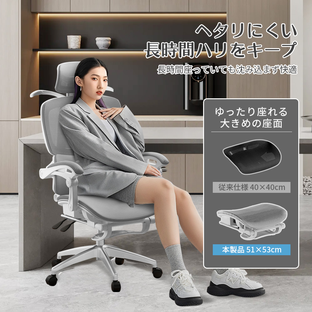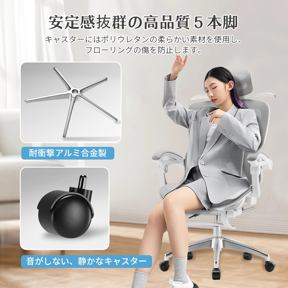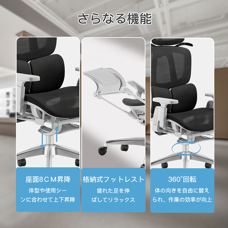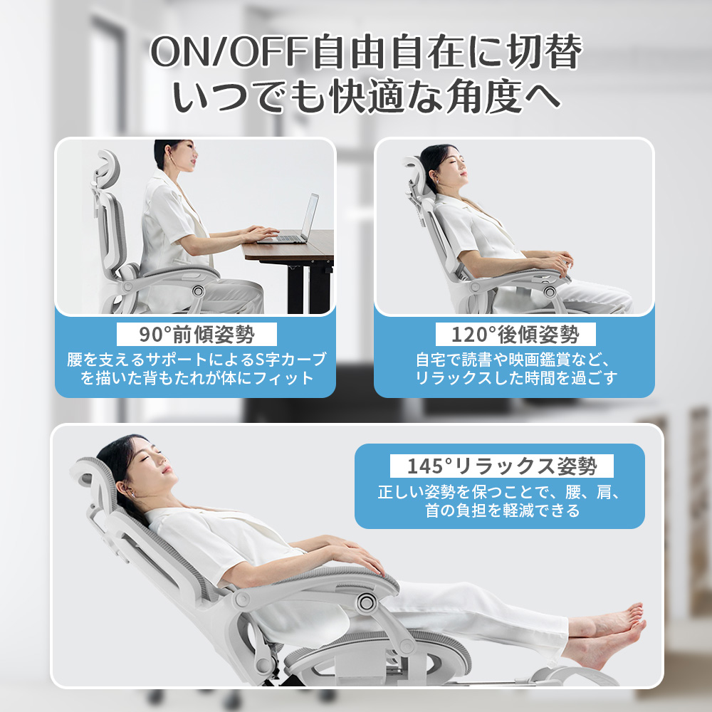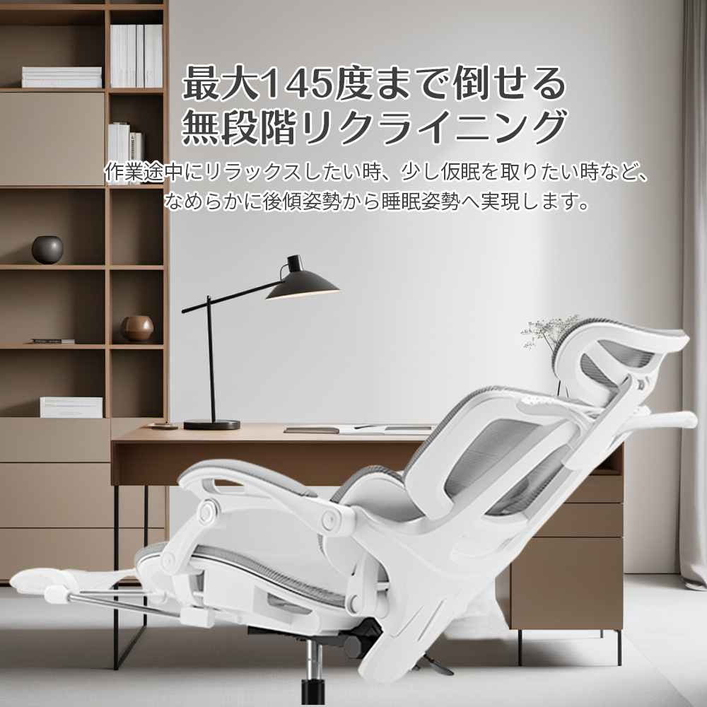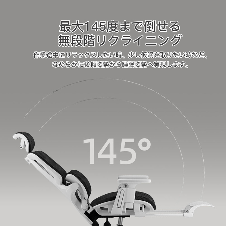 作業途中にリラックスしたい時、少し仮眠を取りたい時など、なめらかに後傾姿勢から睡眠姿勢へ実現します。