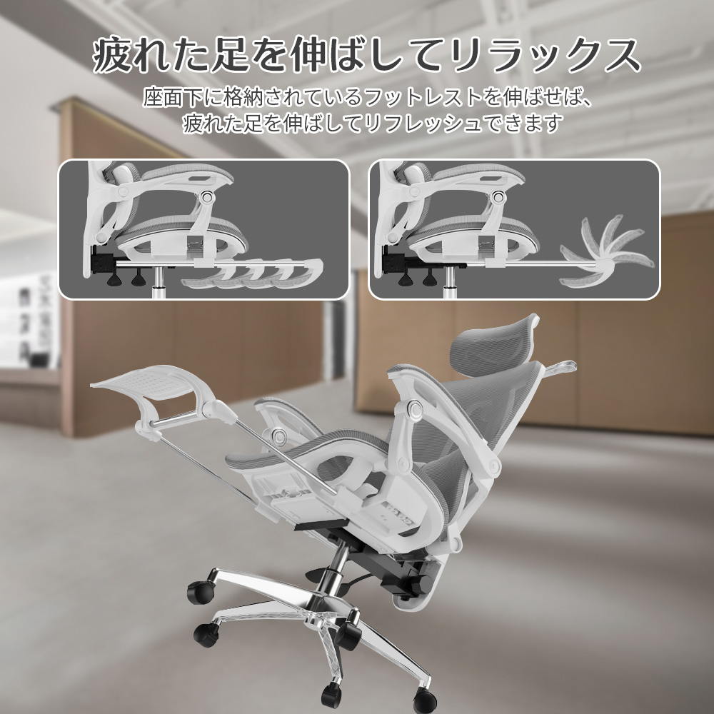 座面下に格納されているフットレストを伸ばせば、疲れた足を伸ばしてリフレッシュできます