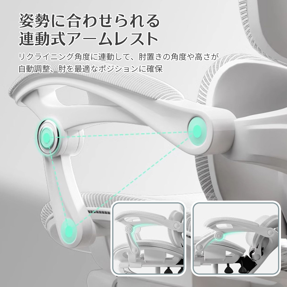 リクライニング角度に連動して、肘置きの角度や高さが自動調整、肘を最適なポジションに確保