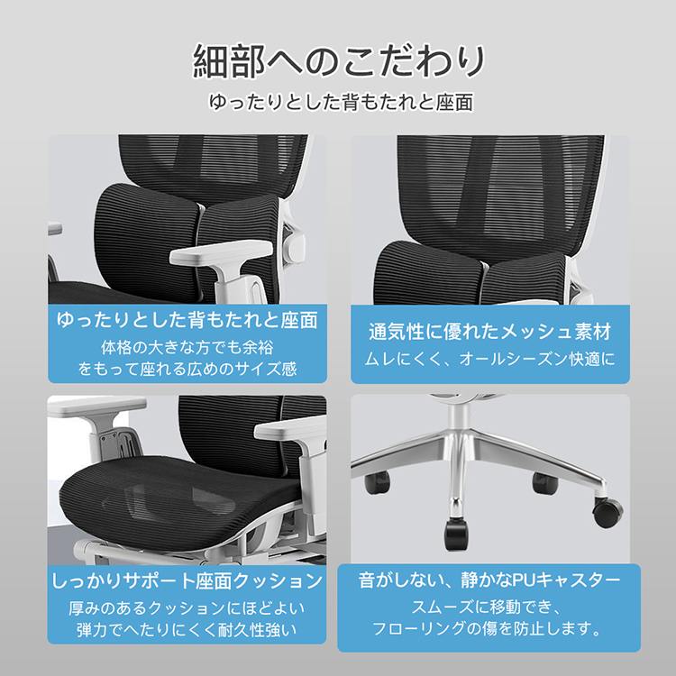 姿勢に合わせて背もたれが背中を追うようにフィットし、優しい座り心地が実現します。