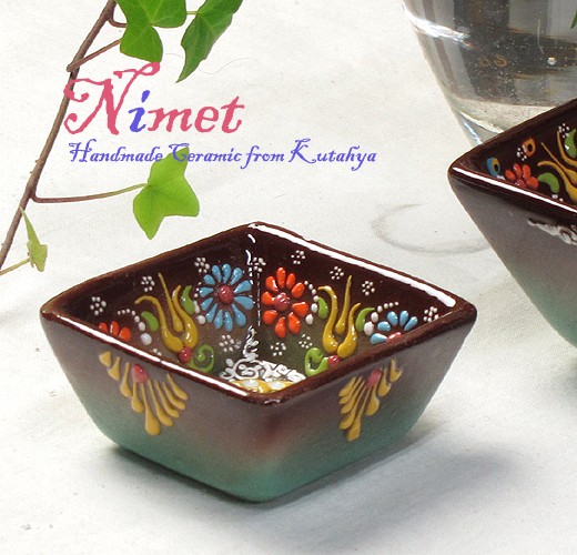 Nimet Design トルコ陶器スクエア角鉢ミニ ブラウン&エメラルドパステルグラデーション 立体釉キュタフヤ陶器