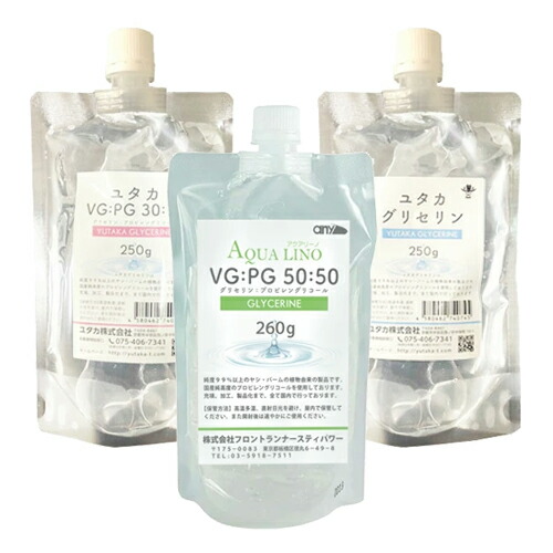 | 商品説明 | 高純度グレード品、透明パウチ仕様 グリセリンは潤滑剤、石鹸や食品、化粧品等にも広く用いられています。 ユタカグリセリンは、純度99%以上のヤシ・パームの植物由来の製品です。国産純高度のプロピレングリコールを使用しております。充填、加工、製品化まで、全て国内で行っております。 【プロピレングリコール(PG)とは】 ● 保湿性や防カビといった特性があり、無味無臭の成分です。 ● 保湿剤としてシャンプーや歯磨き粉、食品添加物としておにぎり、からあげ用の肉など食品にも含まれ、私たちの生活に身近なものにも多く使用されています。 ● グリセリンとフレーバーを組み合わせて電子タバコ用の自作リキッドとしても利用されています。 【植物性グリセリン(VG)とは】 ● ヤシ・パームから採取された、無色透明でやや粘性のある成分です。 ● 植物性グリセリンは化粧品成分として保湿剤として使用されたり柔軟剤にも使用されています。 ● 甘味がある事から、食品添加物として甘味料にも多く使用されています。 ● ハンドメイドスキンケアの保湿剤としても使用されています。化粧水・ボディローションに。 ● 電子たばこのベースリキッドとしても利用されています。 |