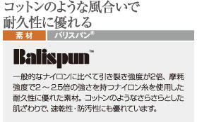 一般的なナイロンに比べて引き裂き強度が2倍、摩耗強度で2〜2.5倍の強さをもつナイロン糸を使用したバリスパン®。コットンのようなさらさらとした風合いを持ちながら非常に耐久性が高く、速乾性・防汚性にも優れています。