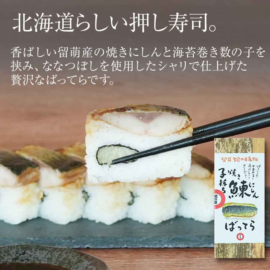 | 名称 | 留萌 蛇の目名物 子持ち焼き鰊ばってら にしんのバッテラ 味付け数の子 北海道産ななつぼし使用 森商店【送料無料】 |