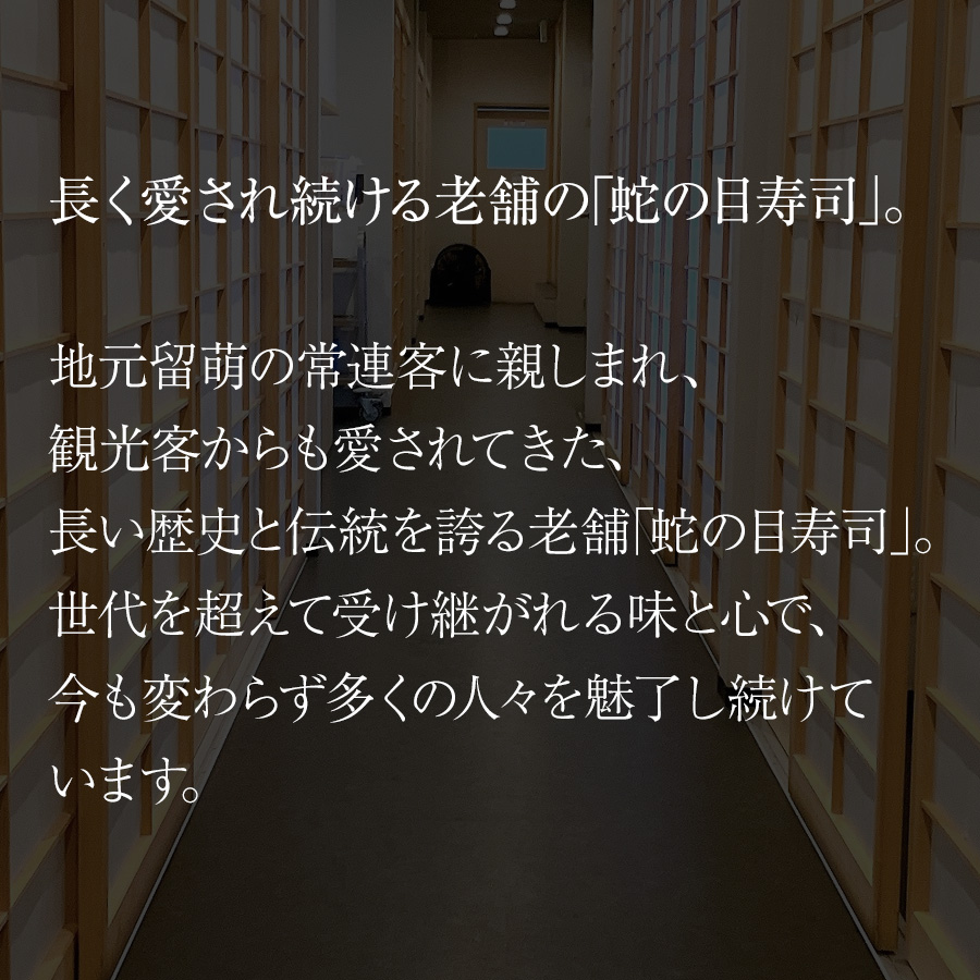 | 特徴 | 留萌産鰊を漬けにして焼き、甘だれを塗り、海苔に巻いた留萌名産味付け数の子をしゃり(留萌産ななつぼしを蛇の目の特別な製法で炊いた)に挟み押し寿司にしました。ポリポリ食感と甘じょっぱい鰊が癖になる程美味です。 |