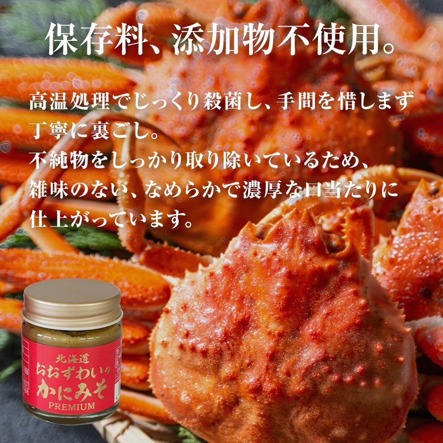 | 特徴 | 北海道産おおずわいがにのかにみそをじっくり高温殺菌処理し、手間を惜しまず丁寧に裏ごし。保存料、添加物不使用の雑味のない蟹みそに仕上げました。 |