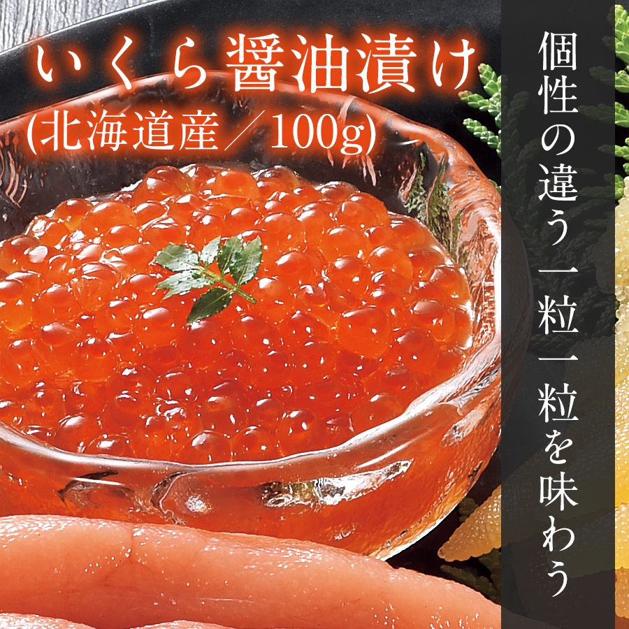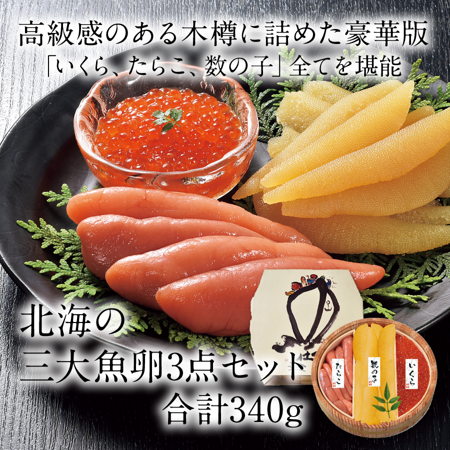 | 内容量 | ●いくら醤油漬(北海道産)/100g ●塩たらこ(アメリカ・ロシア産)/120g ●味付け数の子(カナダ・アメリカ産)/120g |