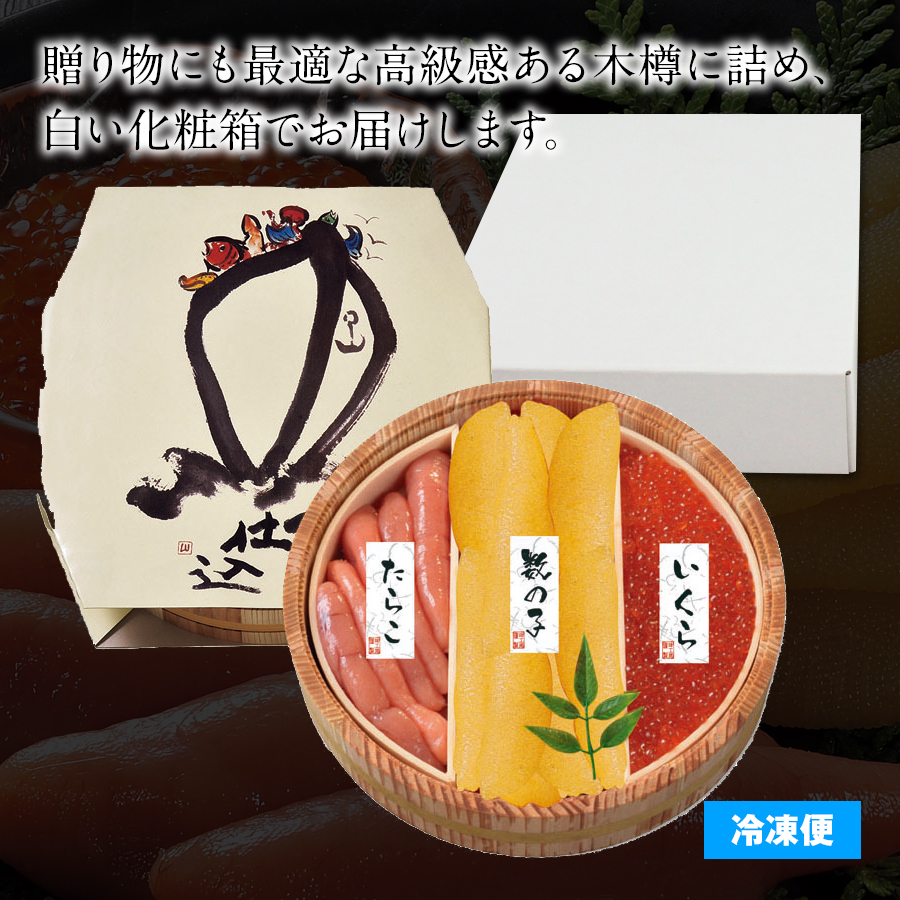 | 特徴 | 冬の定番の魚卵3点(北海道産いくら醤油漬け、塩たらこ、味付け数の子)を木樽に詰合せました。木樽入りの豪華な品ですので贈答用にぴったりな一品となります。 |